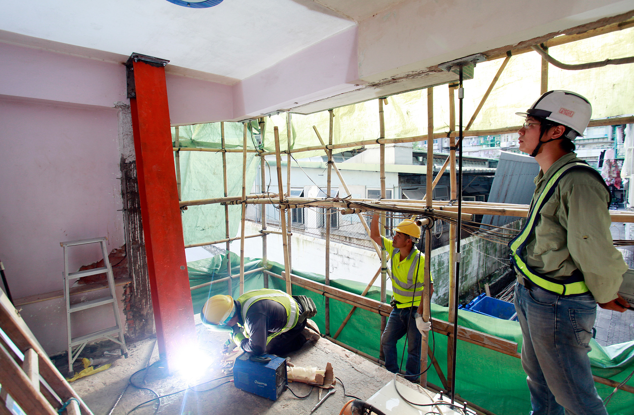 在展開修復前,土地工務運輸局派員到大廈單位及地舖進行了檢查,再次確認現場情況後才落實工程。目前已完成重建大廈地面層受損支柱,原有磚牆已移除及建造了新鋼筋混凝土牆,即涉及大廈地面層的工程已基本完成。按照進度,接下來主要跟進大廈一樓施工,現時已安裝額外臨時斜撐,將移除側面磚牆並建造新鋼筋混凝土牆、拆除一樓支柱的混凝土並重新灌注,最後將恢復相關單位的牆身飾面及批盪。目前工程進展順利,預計今年內可望全部完成。