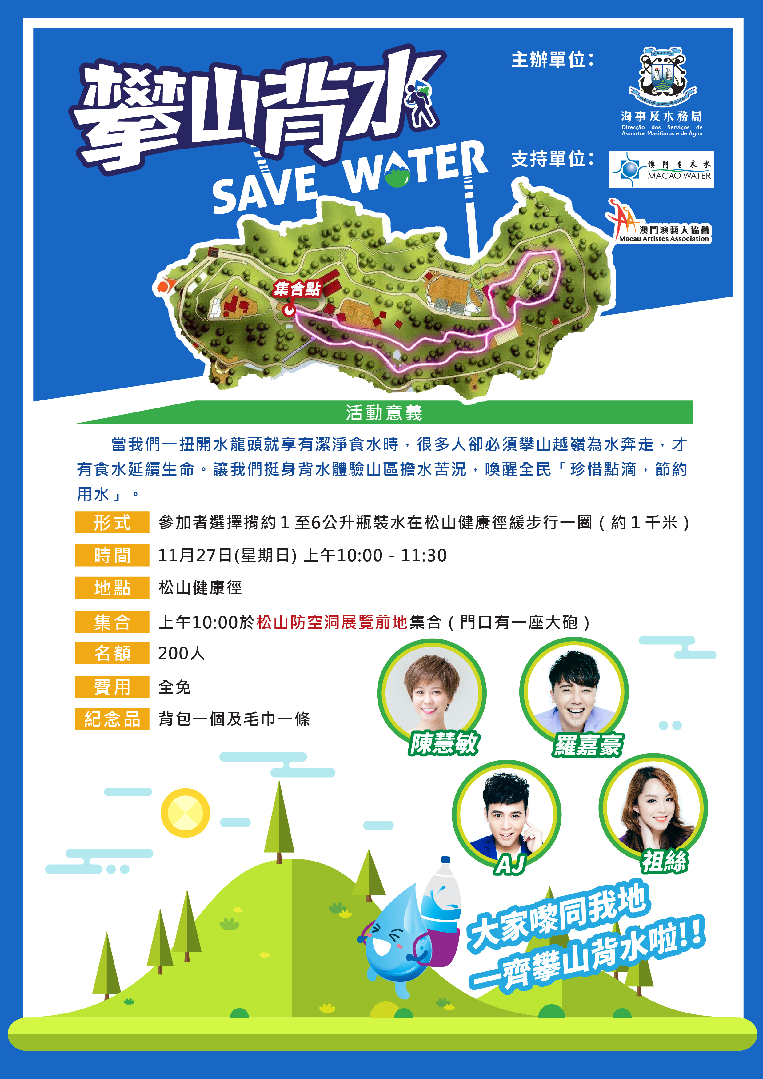 “攀山背水”體驗活動由海事及水務局主辦、澳門自來水股份有限公司及澳門演藝人協會支持。參加者需提前報名,名額為200人,先到先得,參加者可獲贈精美背包及毛巾。有興趣參加的市民,可於由即日起至11月23日,登入海事及水務局網頁(www.marine.gov.mo)進行網上報名,亦可選擇以電郵方式(reg@marine.gov.mo)報名,或於相應的辦公時間內親臨林茂塘海港樓或媽閣海事博物館(逢星期二休館)提交報名表。有關活動的報名方式、條款及細則可瀏覽海事及水務局網頁。