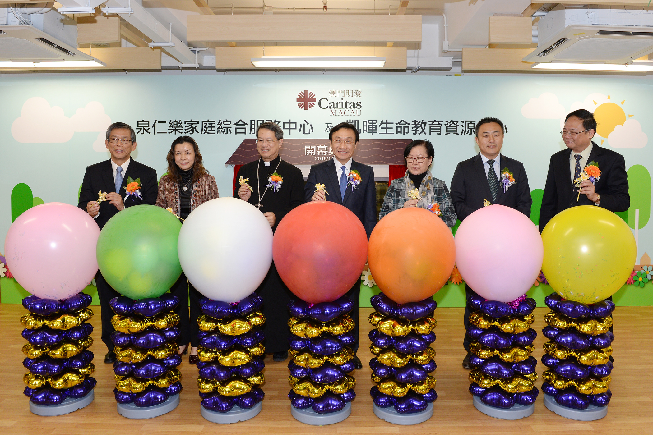 譚俊榮司長在澳門教區李斌生主教、明愛潘志明總幹事及社會工作局黃艷梅局長的陪同下主持兩所中心的揭幕儀式,並聯同中聯辦社會工作部趙維平處長、澳門明愛袁志海服務總監,以及服務使用者代表陳燕周女士共同主持剪綵儀式。