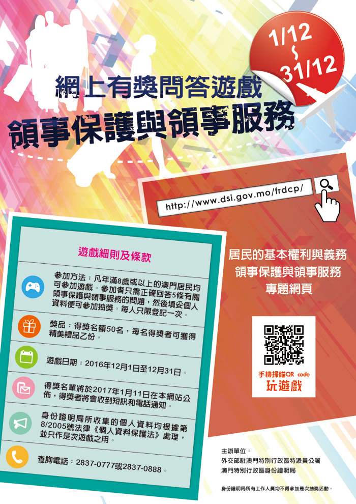 聖誕節及元旦假期為澳門居民到不同國家或地區旅遊的高峰期,為加深澳門市民對領事保護與領事服務的認識,達到安全出行、平安回家的目的,身份證明局推出“領事保護與領事服務有奬問答遊戲”。由即日起至2016 年12月31日,凡年滿8歲或以上的澳門居民可到“居民的基本權利與義務、領事保護與領事服務”專題網頁(www.dsi.gov.mo/frdcp)參加有獎問答遊戲,答對所有問題然後填妥個人資料便可參加抽奬,得奬者可獲得精美禮物乙份,名額50個,歡迎市民踴躍參與。