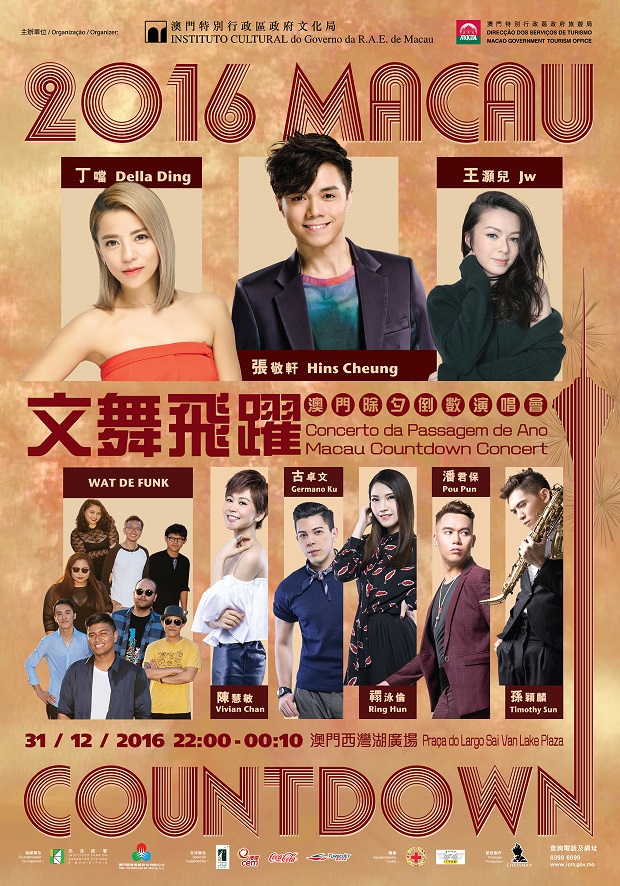 由文化局及旅遊局合辦,民政總署及澳門廣播電視股份有限公司協辦的“二零一六澳門除夕倒數演唱會”和“二零一六氹仔除夕倒數晚會”將於十二月三十一日晚上,分別在澳門西灣湖廣場和氹仔龍環葡韻舉行,為市民送上連場精彩演出,當晚更將有超過一萬發煙火在倒數完畢踏入二零一七年的一刻於旅遊塔對出海面綻放,點綴澳門夜空,迎接新年蒞臨。