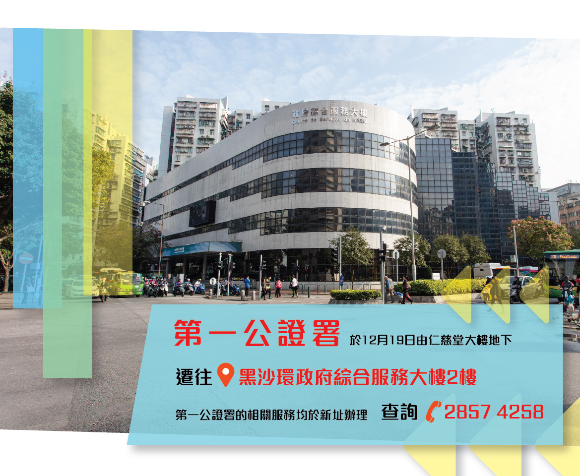 澳門特別行政區第一公證署將於2016年12月19日(星期一)起,由澳門議事亭前地16號仁慈堂大樓地下遷往澳門黑沙環新街52號政府綜合服務大樓 二樓,屆時第一公證署的相關服務均於新址辦理。