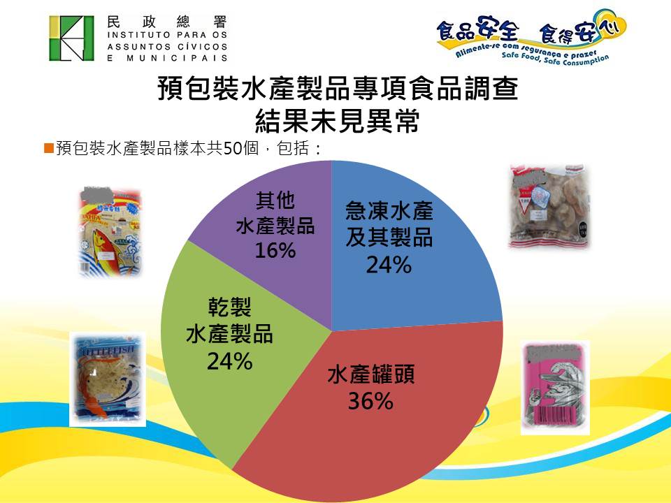 預包裝水產製品是本澳市售常見的食品,考慮到重金屬容易累積於魚、貝類等水產,而一般的加工工藝亦無法完全去除水產中的重金屬,市民若食用受污染的水產製品,重金屬便會透過食物鏈進入人體;此外,業界為保留預包裝水產製品的風味和延長保存期限,會添加一定量的食品添加劑,如加入甜味劑增加甜味、加入防腐劑延長保存期限等。是次專項調查中,民署分別抽查本澳各區超級市場及百貨公司出售的預包裝水產製品,產地包括中國、台灣、香港、日本、韓國、泰國、馬來西亞、菲律賓、印度尼西亞、越南、德國、葡國、挪威、冰島、澳洲、拉脫維亞、摩洛哥、南美等國家或地區;種類涵蓋不同品牌的預包裝冷凍水產、水產罐頭、乾製水產等共五十個樣本,進行的重金屬檢測項目包括鉛、鎘、砷、汞及錫,食品添加劑檢測項目包括安賽蜜、阿斯巴甜、糖精、甜菊糖苷、紐甜及山梨酸。調查結果顯示所有樣本均未見異常。