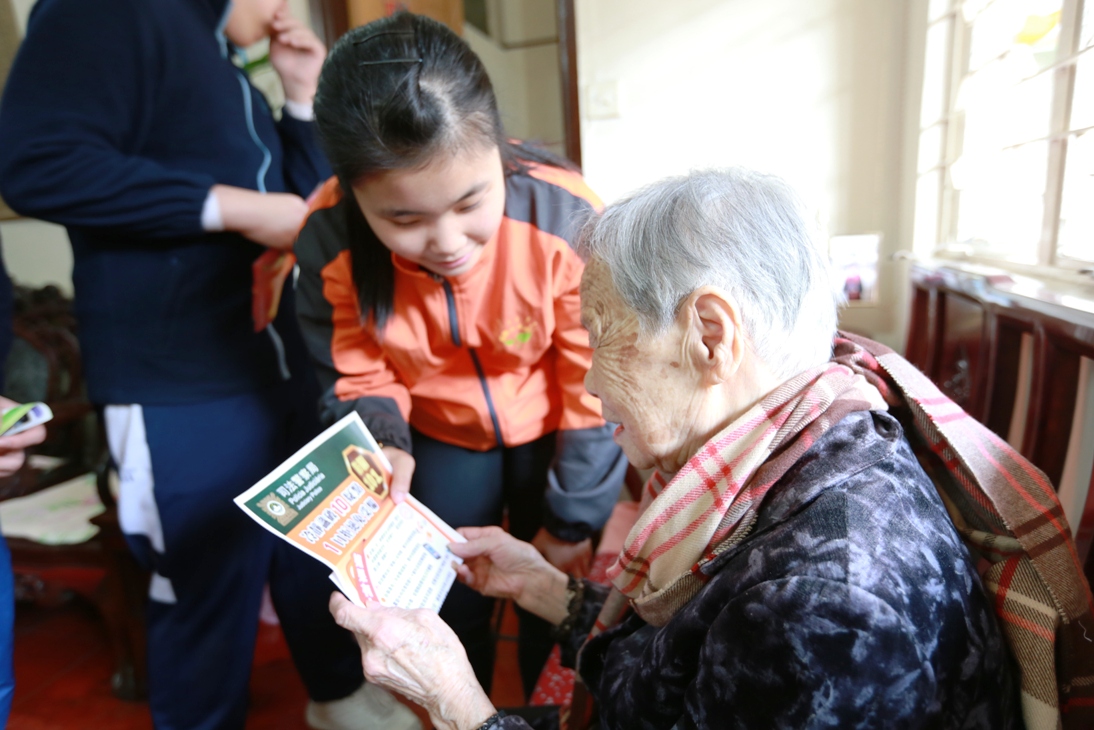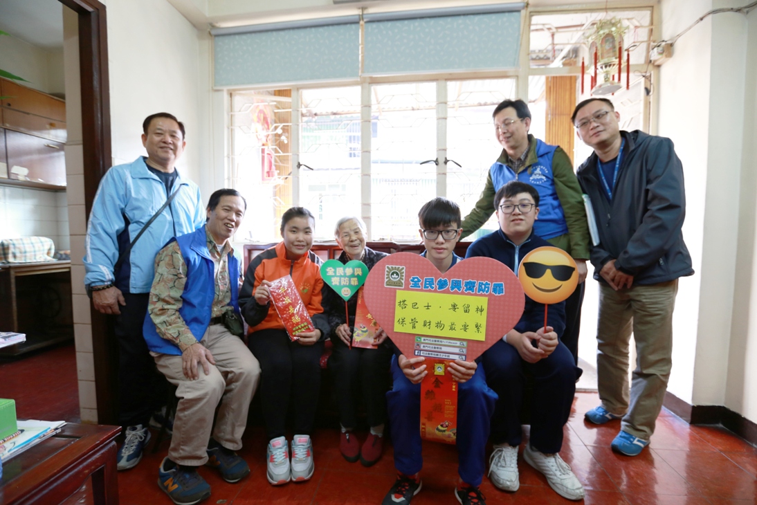 農曆新年前夕,司法警察局組織 “滅罪小先鋒種子計劃” 學員進行關愛獨居長者春節送暖活動,前往北區探訪獨居長者,送上新春福包和節日祝福,細心提醒長者們歲晚期間注意做好防罪措施。一班滅罪小先鋒學員更發揮朋輩影響力,發動其就讀學校的同學們一起參與是次探訪活動,向青少年宣揚關愛社會、服務社會的正面訊息。