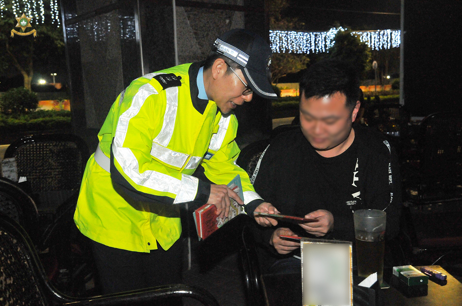 昨晚十時許,由本局交通廳李勤副警司聯同行動廳公共關係處黃偉俊副警司,帶領宣傳小隊一行七人到皇朝一帶進行相關宣傳活動。期間,沿途向酒吧內市民和旅客派發宣傳單張和賀年祝福利是封,並向他們講解在任何場所時刻都需具有自我保護的安全意識、拒絕陌生人提供不知名食品或飲料,以及提醒他們在歡欣後,緊記切勿酒後駕駛等。活動期間,警員讓市民及遊客嘗試以酒精測試機進行呼氣測試,他們亦有相當興趣體驗。