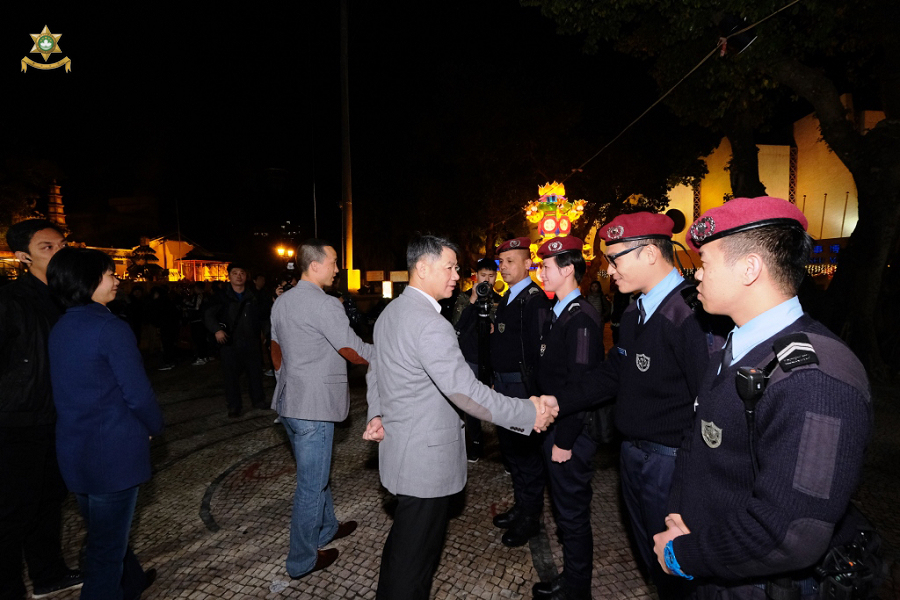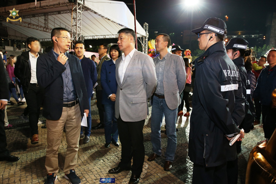 除夕當晚,治安警察局梁文昌局長及黃子暉副局長帶領多位治安警察局主管人員實地走進多個人群聚集點巡視及瞭解各項安保工作情況,務求為廣大市民提供更快捷、便民及優質服務,使大眾平安歡度春節。