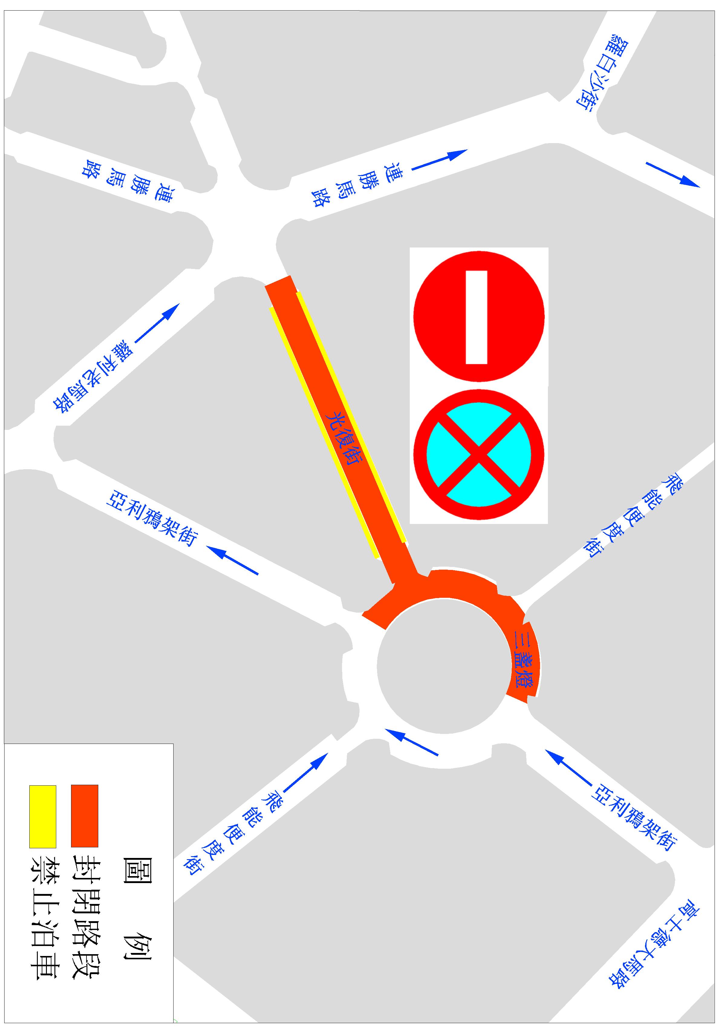 2月9日(周四)上午9時起,介乎連勝馬路與三盞燈之間的一段光復街禁止泊車,同日晚上10時起,介乎連勝馬路與三盞燈之間的一段光復街咪錶位亦禁止泊車,上述安排直至13日(周一)下午1時止。