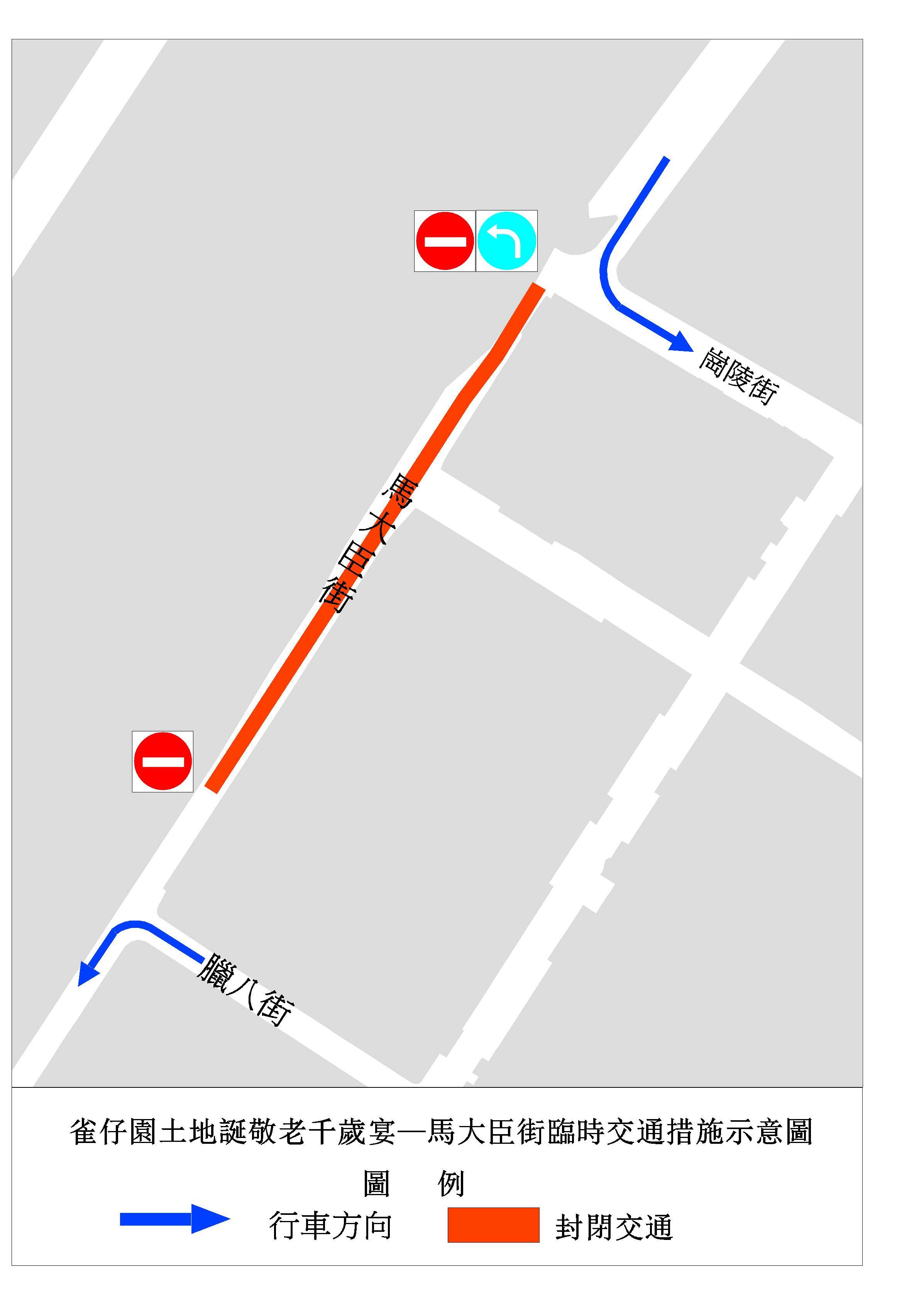 配合澳門雀仔園福德祠土地廟值理會舉辦活動,3月2日(周四)下午3時至晚上11時,介乎崗陵街與臘八街之間的一段馬大臣街將在警方協助下實施封閉交通及禁止泊車,進出停車場車輛除外。