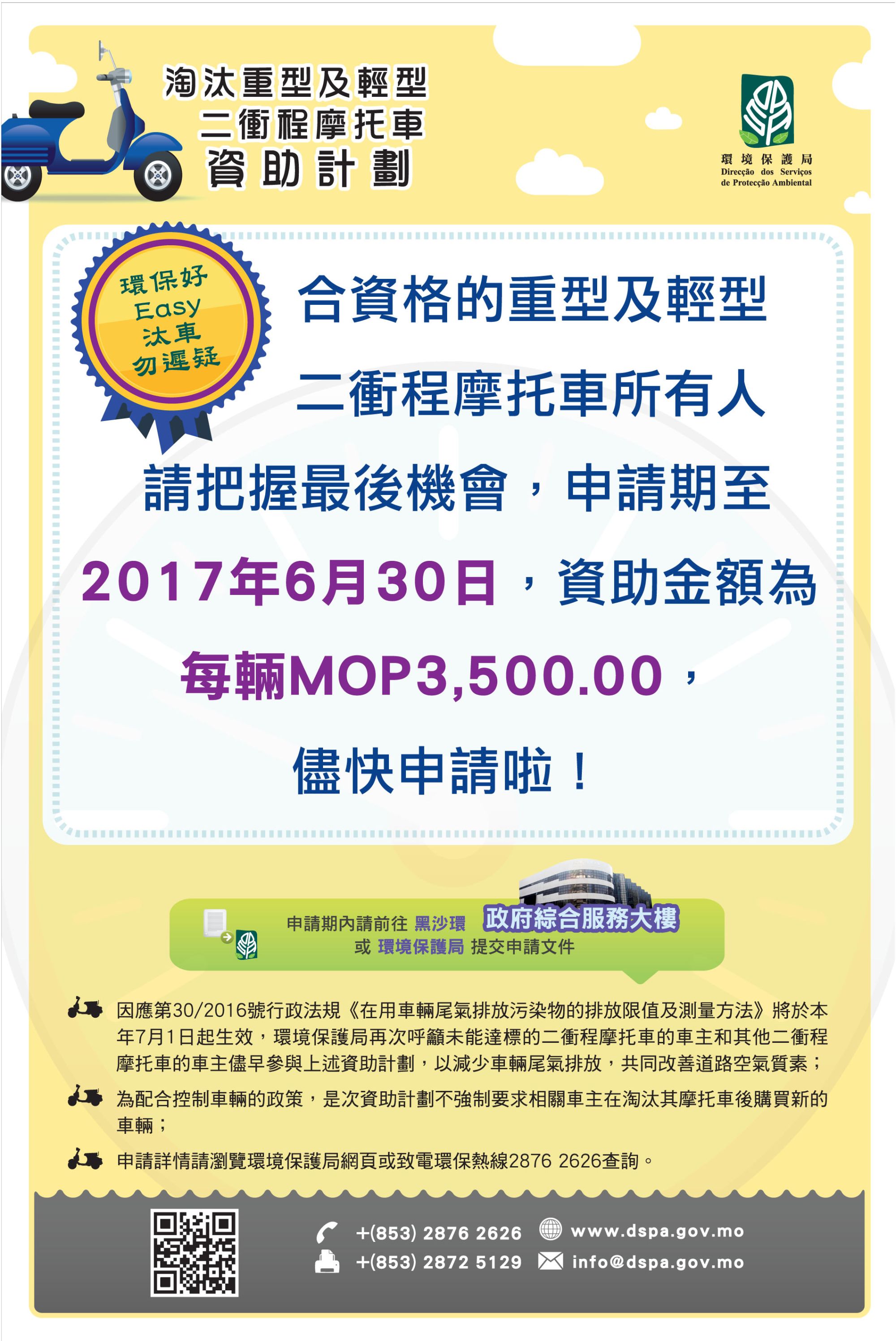 因應第30/2016號行政法規《在用車輛尾氣排放污染物的排放限值及測量方法》將於本年7月1日起生效,局方再次呼籲未能達到上上述標準的二衝程摩托車的車主和其他二衝程摩托車的車主儘早參與是次資助計劃,共同改善本澳道路空氣質素。有意申請者請儘早到黑沙環政府綜合服務大樓(黑沙環新街52號,星期一至五上午9時至下午6時,中午不休息)或環境保護局(馬交石炮台馬路11號至11號D郵政大樓地下)提交申請文件,亦可在網上預約到黑沙環政府綜合服務大樓提交申請文件的時間(網址為:https://app.iacm.gov.mo/booking/webBookingAction.do,請選擇有關網站內的“工務專區”),或致電政府綜合服務大樓(2845 1515)以協助進行預約,申請詳情可致電“環保熱線” (2876 2626)查詢。