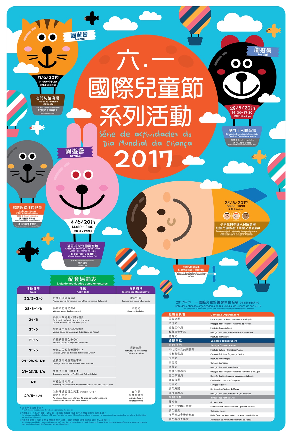為了慶祝“六.一國際兒童節”, 喚起社會關注兒童的權利和福祉, “2017年六一國際兒童節組織委員會”聯同相關政府部門及民間團體在5月22日至6月11日期間舉辦系列以“兒童權利"之受保護權為主題的慶祝活動,讓本澳市民一同感受節日氣氛,歡度兒童節。