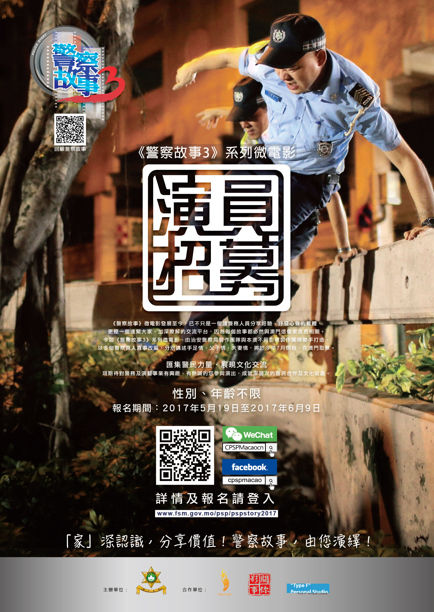 為進一步加深警民聯繫及瞭解,特舉行《警察故事3》微電影的演員招募行動,讓全澳市民參與其中,豐富體驗,展現才能。招募期間由即日起至2017年6月9日止,歡迎對警務及演藝事業有興趣、天賦及專業人士報名參與,「匯集警民力量‧展現文化交流」。