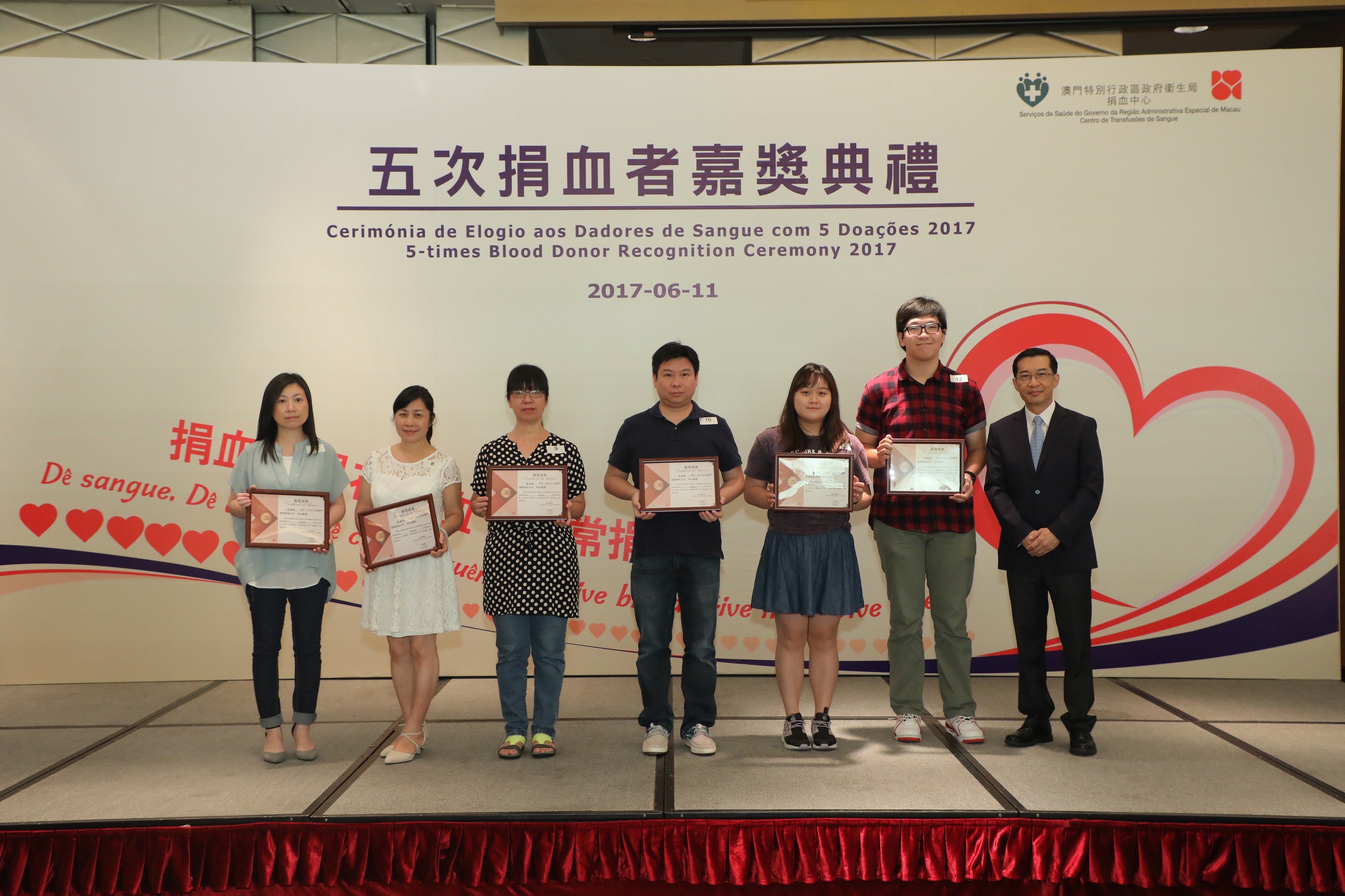 衛生局今日(6月11日)舉行了2017年『世界捐血者日』活動系列之一的『五次捐血者嘉奬典禮』。是次嘉奬典禮邀請的對象是2016年度捐血達5次的捐血者出席,合資格的捐血者共有738人,今日出席的人數共逾300人。衛生局鄭成業副局長、李偉成代副局長及捐血中心許萍主任向出席的捐血者頒發『五次捐血嘉奬證書』。