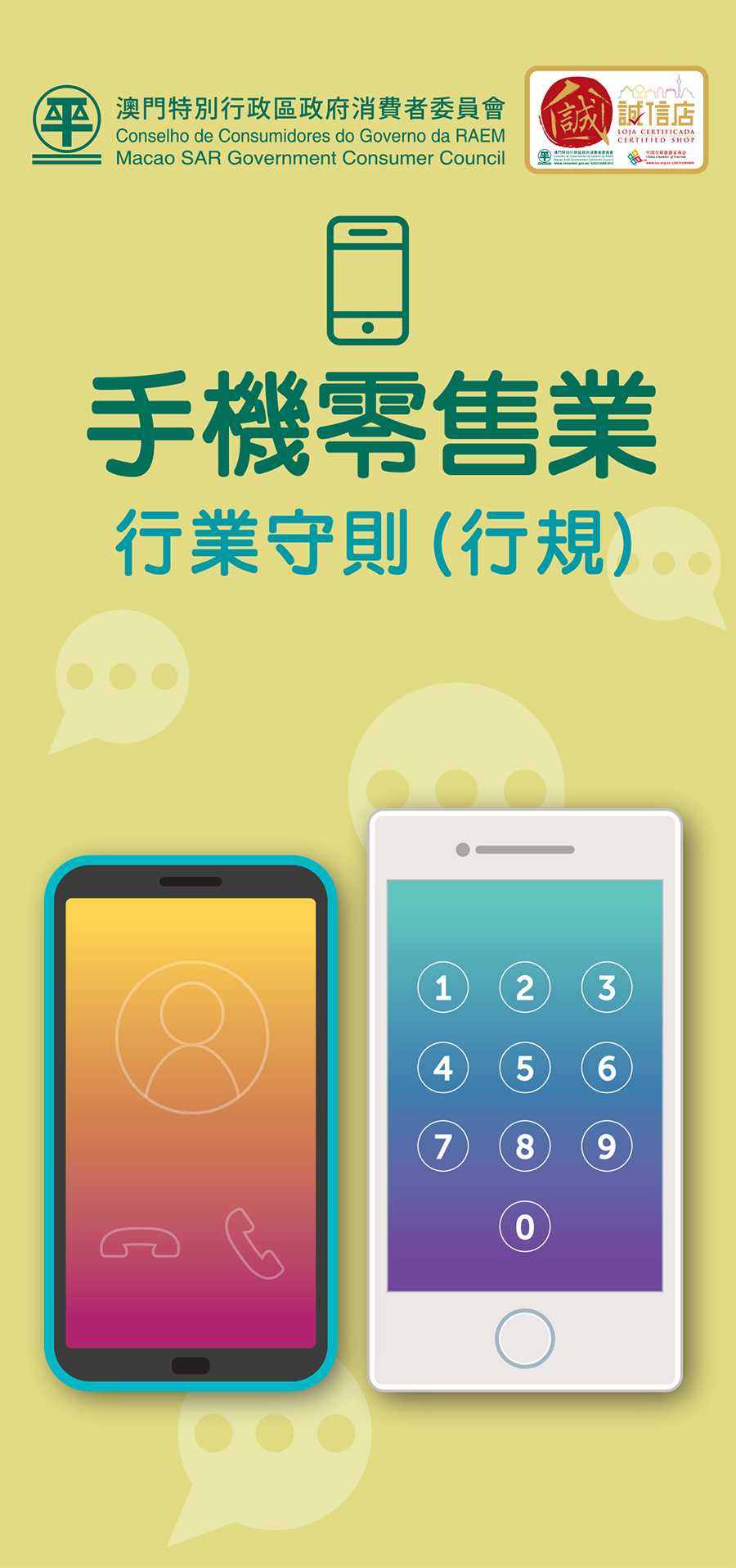 消委會已製印“手機零售業行業守則”的中、葡、英版本單張,擺放在消委會接待處供公眾免費索取,單張的電子版亦已上載到消委會網頁(www.consumer.gov.mo)供各界瀏覽。