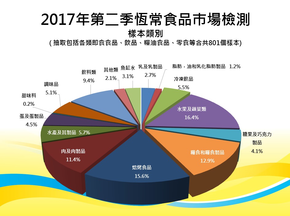 為保障消費者的食用安全,食安中心依據目前流通市場的食品種類和特點,制定各類型的食品調查抽樣計劃,包括“常規食品調查”及“食肆食品調查”計劃。抽樣調查的範圍包括本澳各區之超級市場、雜貨店、百貨公司、飲食場所、網店及外賣店等,抽取各類即食食品、飲品、糧油食品、零食等。食安中心在本年第二季合共抽取八百零一個樣本進行化學、微生物學及輻射水平等檢驗,整體合格率99.5%。