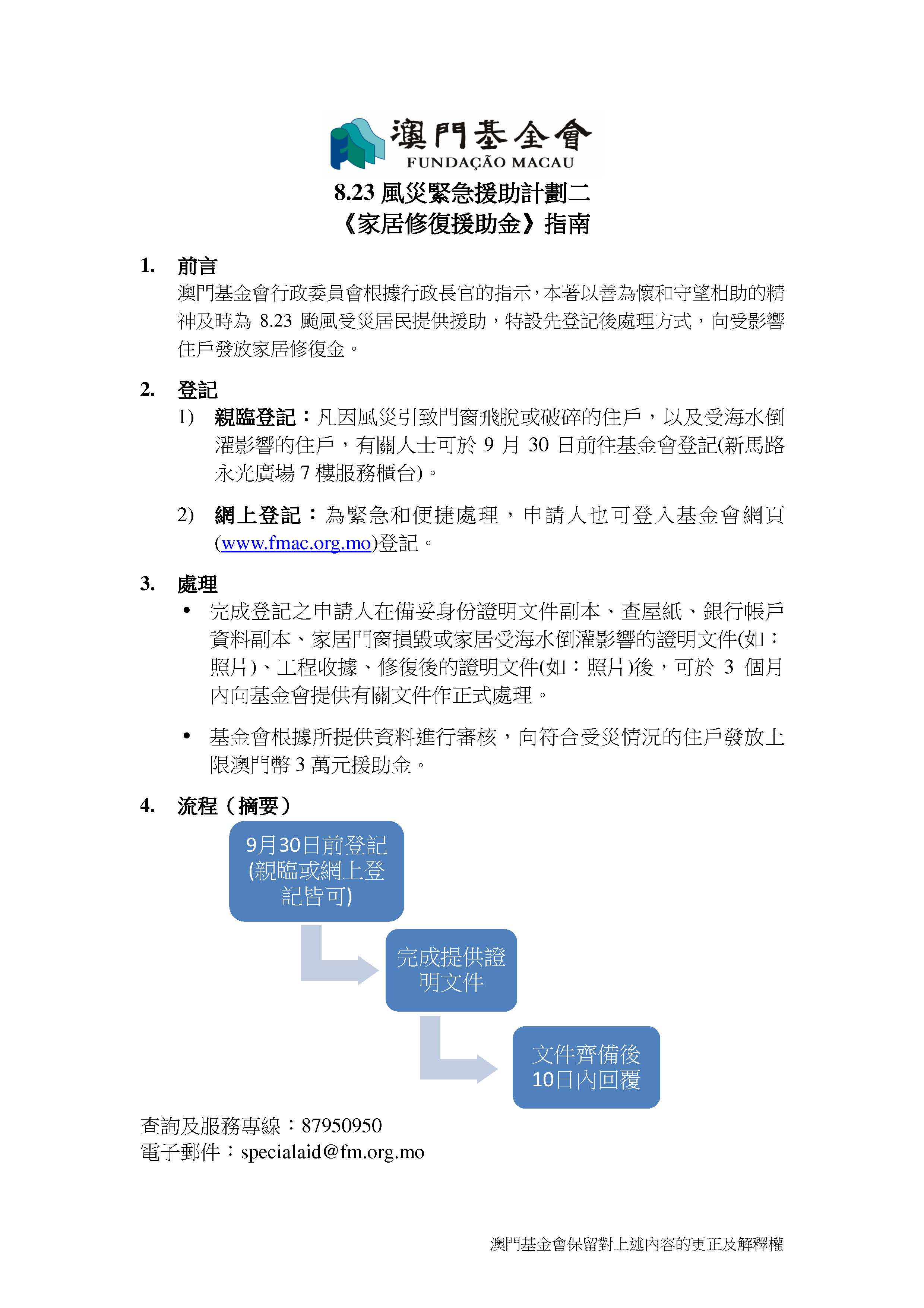 澳門基金會呼籲“家居修復援助金”及“醫療慰問金”的申請者仔細了解申請流程,並於澳基會網站先行登記,無須急於親身前往申請。為方便市民了解及辦理登記,澳基會將於本周六日 (8月26日及27日)照常辦公,中午不休息。澳基會再次提醒市民,醫療慰問金的申請截止日期為8月31日,家居修復援助金的申請截止日期為9月30日。查詢電話:8795 0950