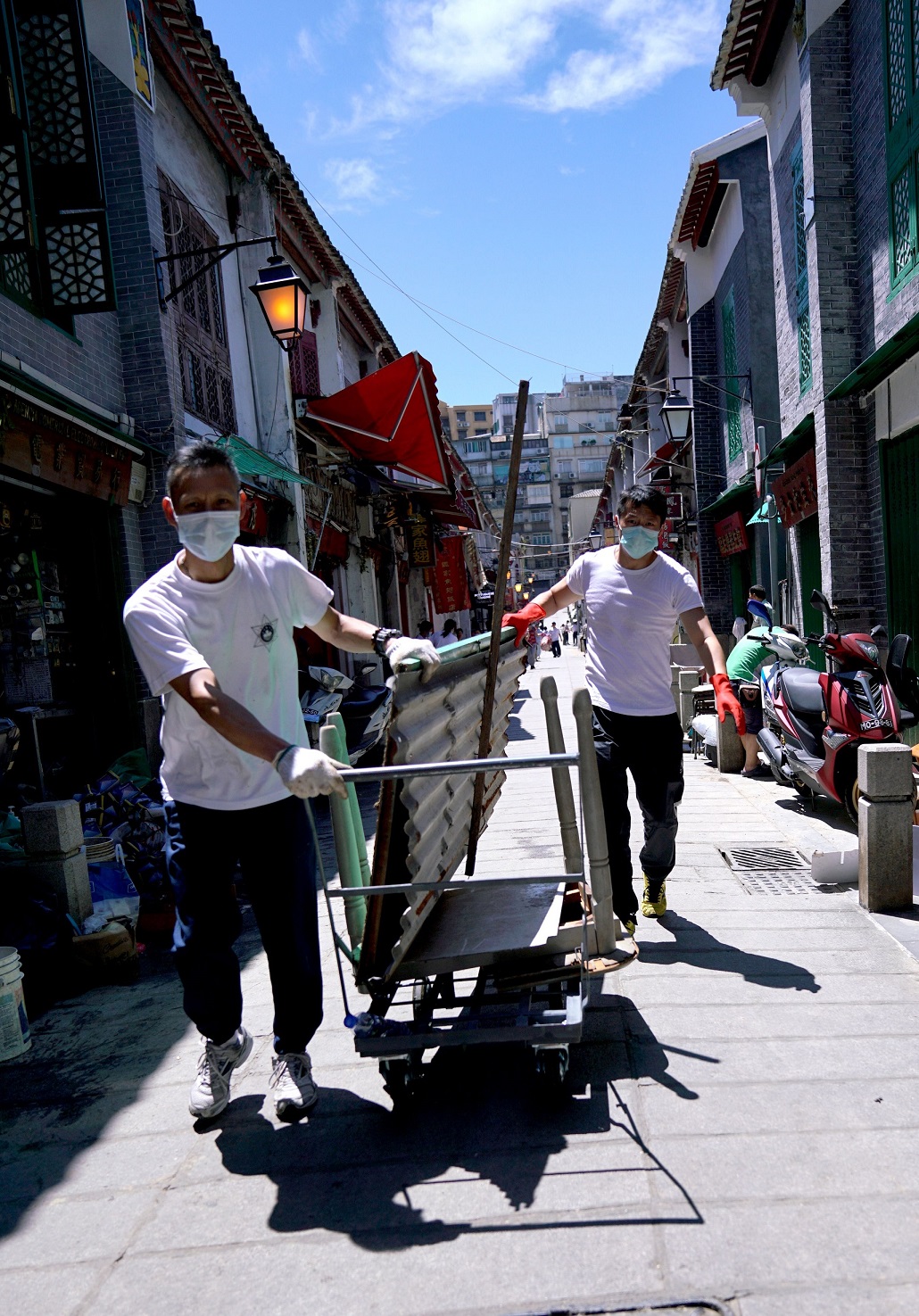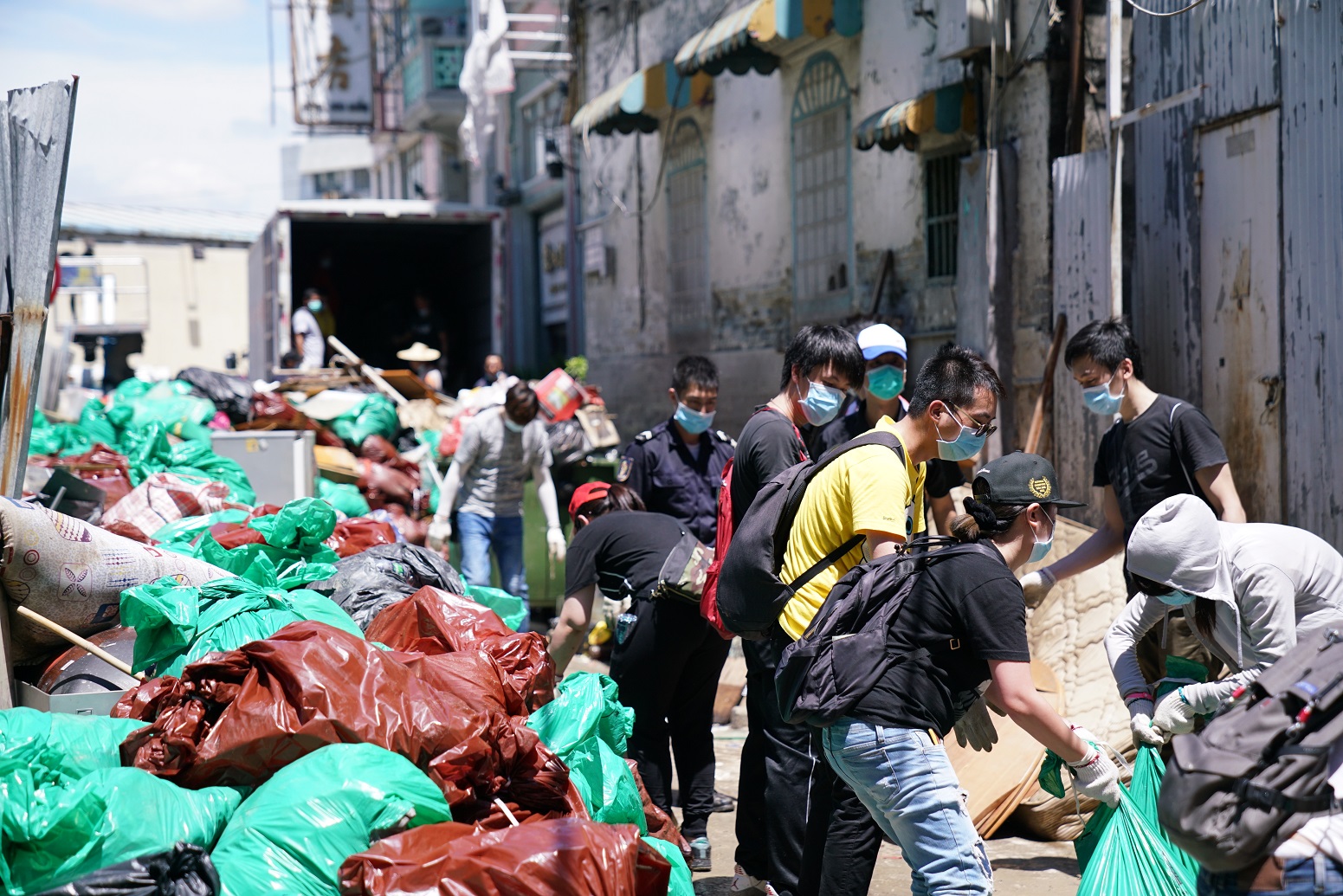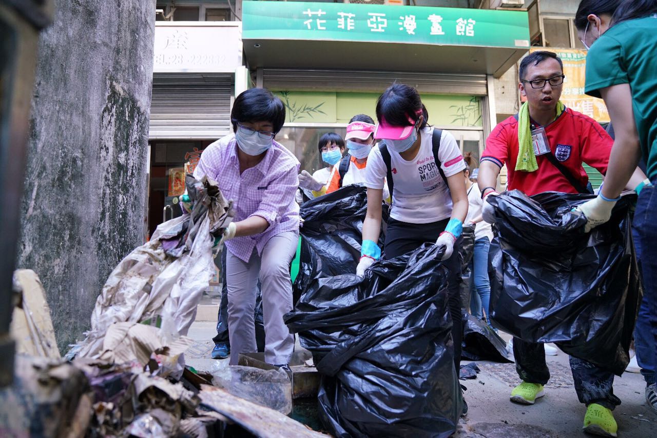 民署今早協調各公務員義工隊伍,分別到司打口、內港、爐石塘、沙梨頭、筷子基、青洲及黑沙環等一帶協助清理垃圾及雜物,以及派發垃圾袋等物資。行政法務司司長陳海帆聯同公務員義工隊伍由司打口公園出發,前往安仿西街、夜姆街、蓬萊新街等一帶,沿途一起協助清理受水淹浸店舖棄置的垃圾,並合力將垃圾用膠袋包好,送上收集垃圾的貨車。