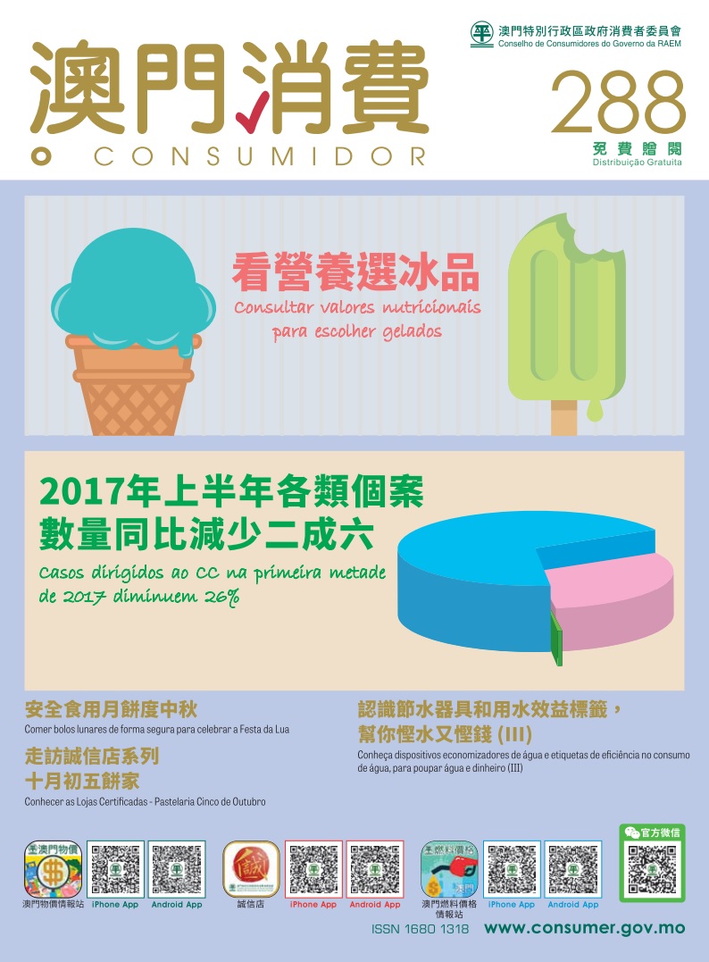 新出版的第288期《澳門消費》刊載消費者委員會與民政總署食品安全中心聯合抽查市面的雪糕及冰甜點,30款樣本全部通過微生物的檢測標準。雪糕及冰甜點屬於高熱量及高糖份的食品,消委會建議消費者應適量進食。