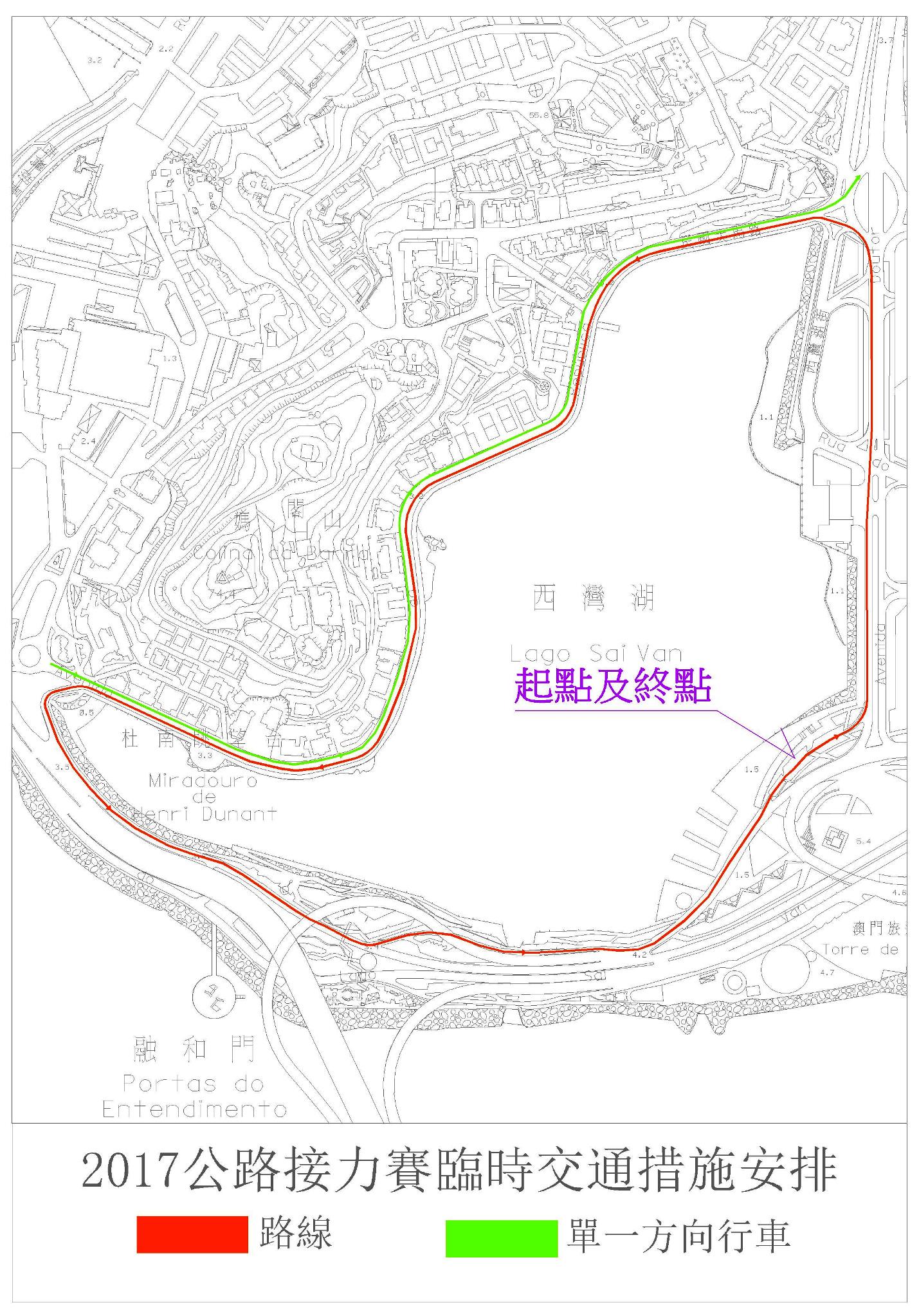 9月24日(周日)凌晨4時至中午12時,西灣湖廣場、西灣湖景大馬路、何鴻燊博士大馬路及民國大馬路實施有限度通車;同日(24日)上午6時至中午12時,民國大馬路(何鴻燊博士大馬路往媽閣上街方向)、靠湖的一側西灣湖景大馬路實施封閉交通;而另一側民國大馬路則改為單向交通,即媽閣上街往何鴻燊博士大馬路方向行駛;屆時,9、9A、18、23及32巴士路線需改道行駛,“初級法院刑事大樓”站、“民國馬路/西灣湖”站、“西灣”站、“半邊橙”站、“媽閣上街臨時站”則暫停使用。
