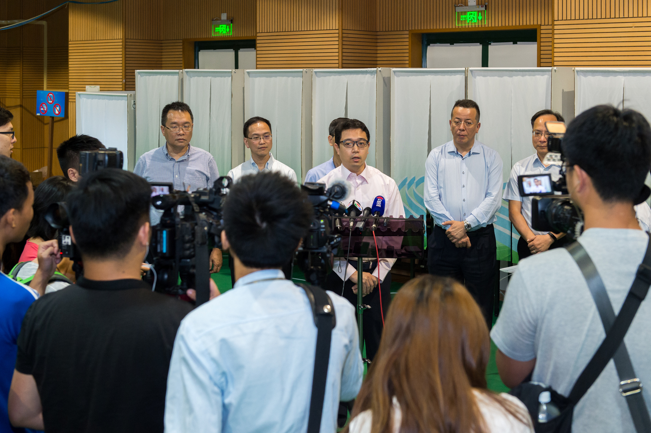 立法會選舉管理委員會成員下午到投票站內巡視,視察票站的準備情況。主席唐曉峰表示,全澳有36個投票地點,共42個直選及間選投票站,部分已準備就緒,其餘的票站亦正密鑼緊鼓地進行改裝工程,相信今晚能完成票站的佈置及安裝工程。