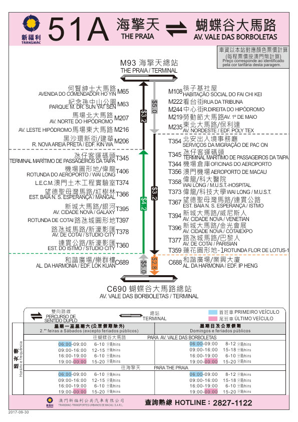 由9月30日(周六)首班車起,往筷子基北灣的26路線取消停靠 “澳門機場”及“機場倉庫”巴士站,而51A路線去回程均新增停靠 “氹仔客運碼頭”站,以進一步優化巴士路線運作和站點安排。交通事務局呼籲乘客留意。