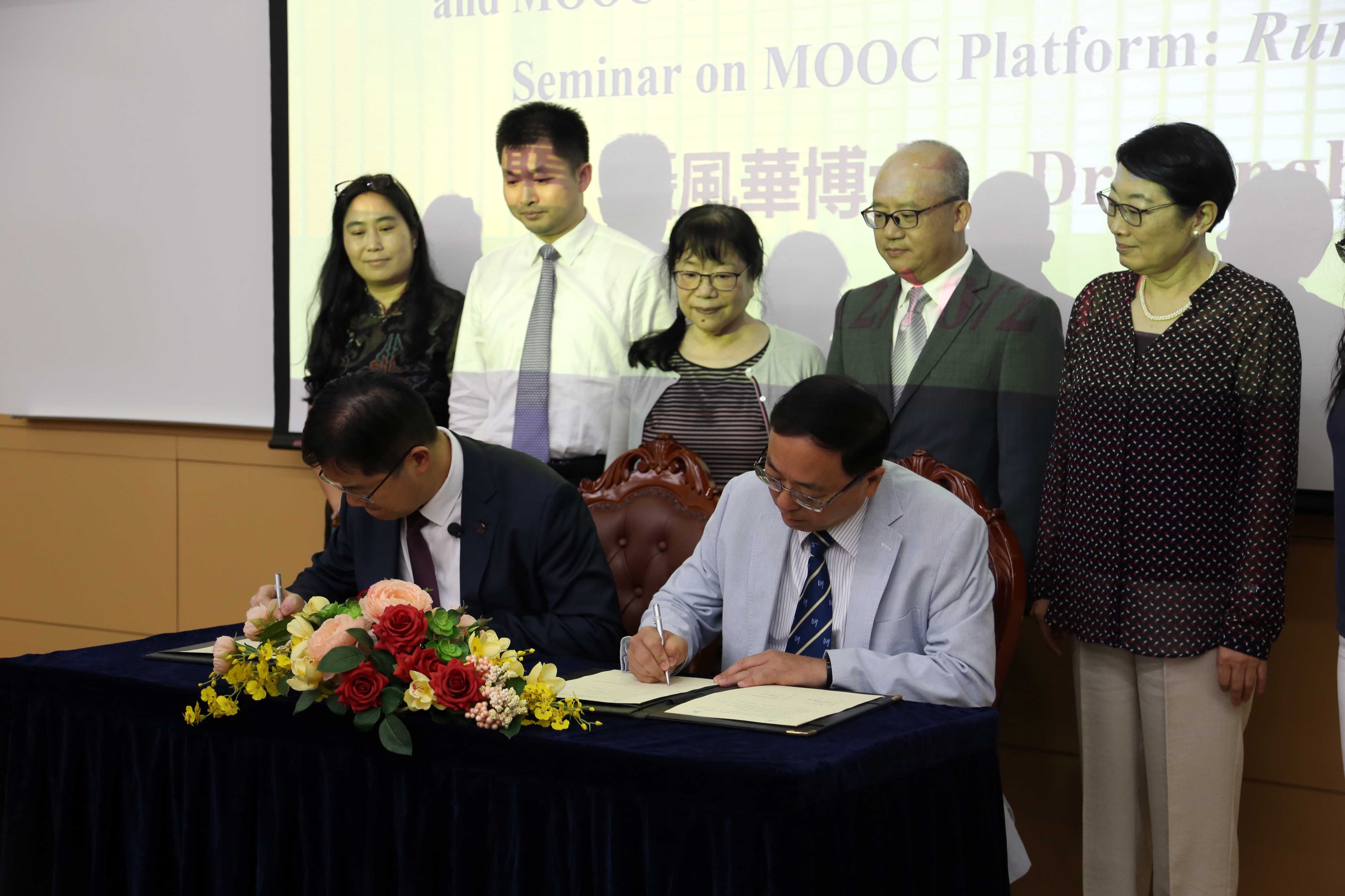 為有效地在澳門推廣在線教育,澳大與北京慕華信息科技有限公司訂定了戰略合作協議,共同開展MOOC建設課程,並為澳大提供SPOC (Small Private Online Course) 在線教學平台。簽署儀式在高等教育輔助辦公室副主任曾冠雄等一眾嘉賓的見證下,由澳大副校長(學術)倪明選和北京慕華信息科技有限公司董事長聶風華代表雙方簽約。