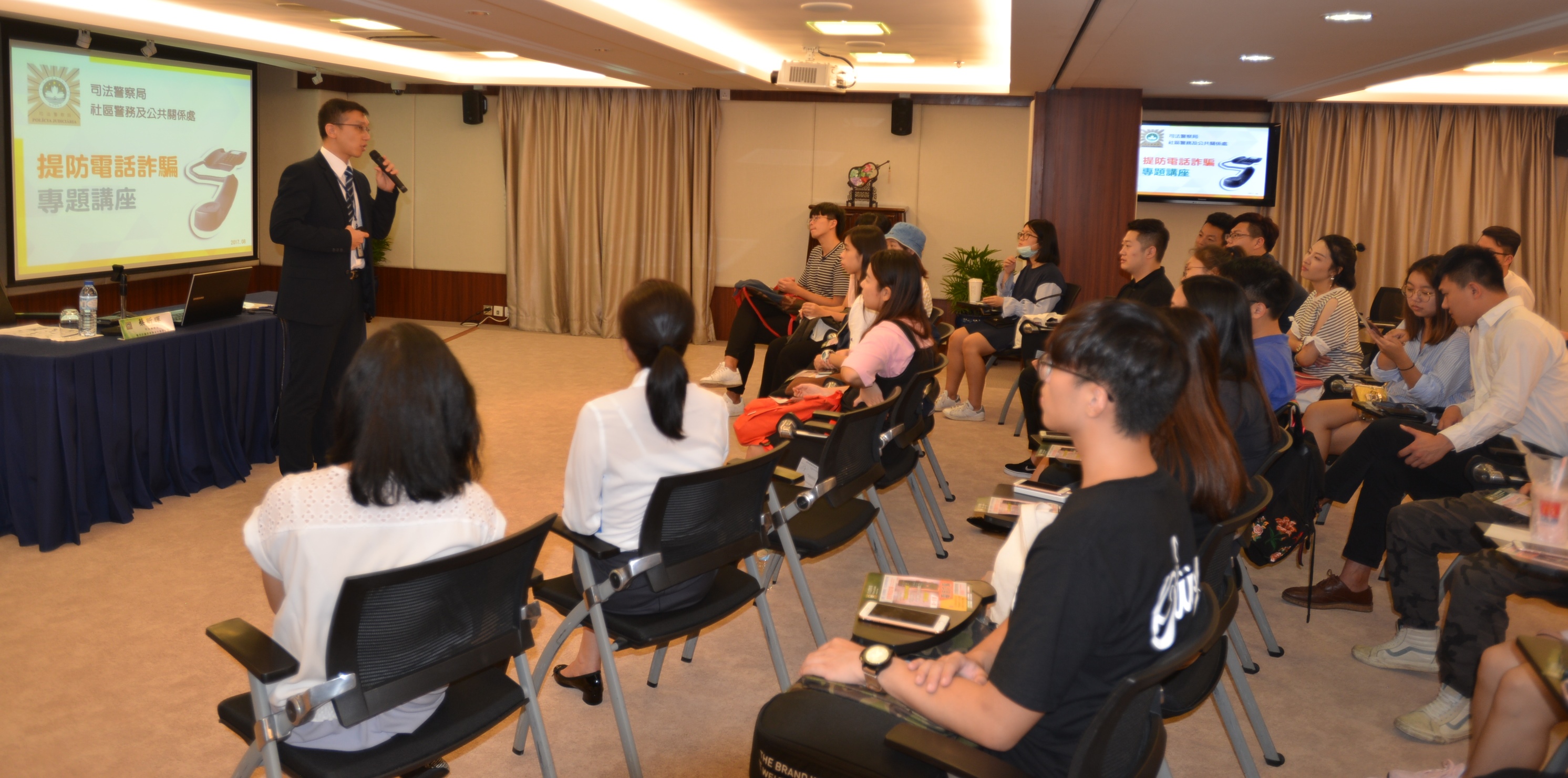 為了加強本澳高校學生社團對電話騙案的瞭解,提高防騙意識,高等教育輔助辦公室日前舉辦了“提防電話詐騙”專題講座,邀請司法警察局代表講解最新的電話詐騙手法以及防騙策略等,吸引本澳11個高校學生社團近30名代表參加。