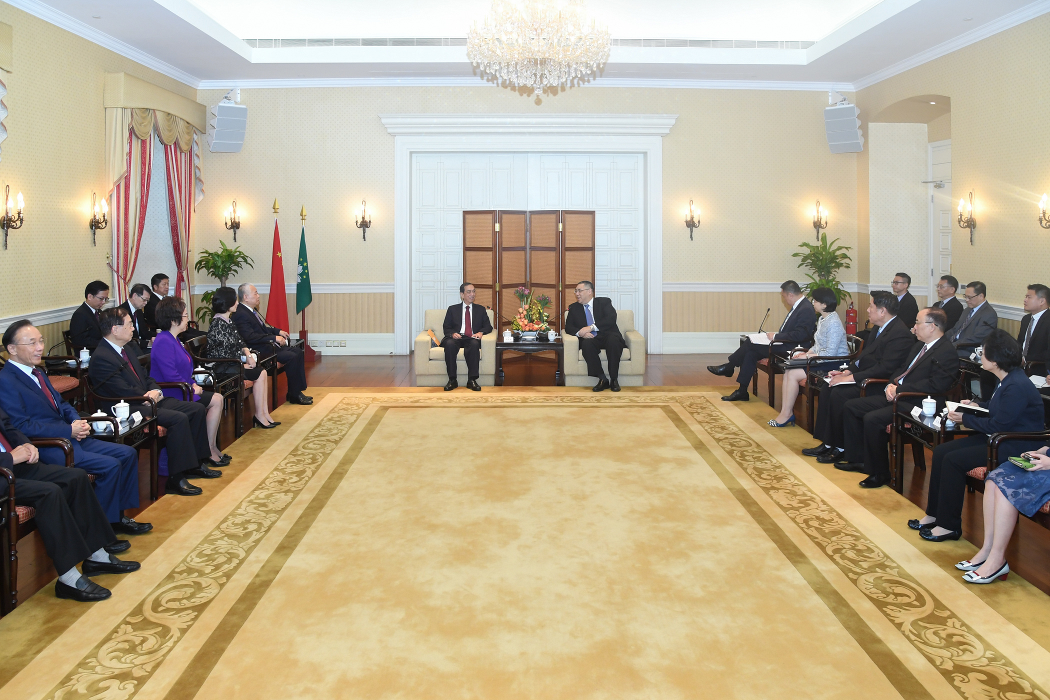 參加會見的還包括行政長官辦公室主任柯嵐、政策研究室主任劉本立、行政長官辦公室顧問胡根、李雁玲及鄧安琪、政策研究室首席顧問米健及副主任吳海恩;澳門中華總商會副會長顏延齡、副理事長賀定一、李志忠、何佩芬、何富強、秘書長區榮智等。