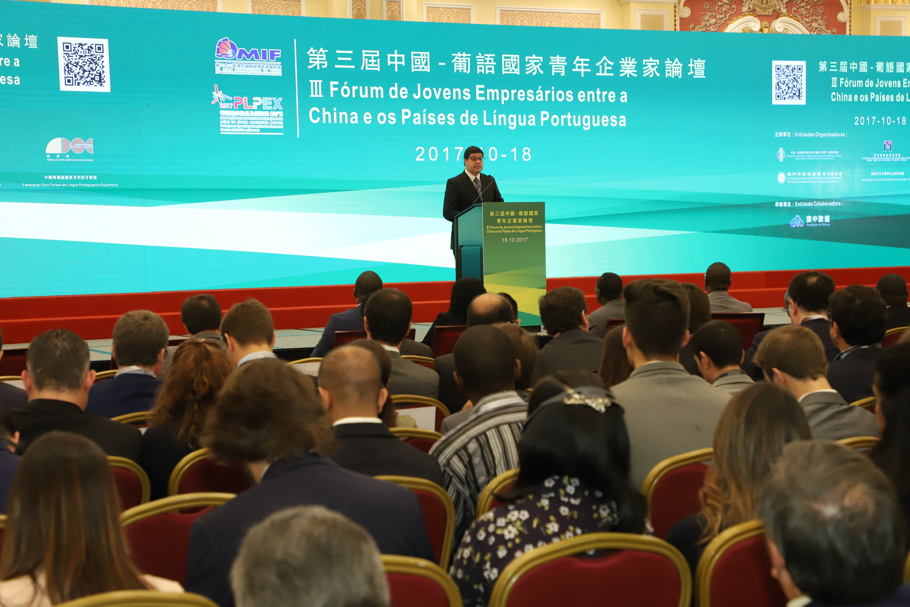 由中國-葡語國家經貿合作論壇(澳門)常設秘書處、澳門貿易投資促進局、經濟局、澳門中華總商會青年委員會、葡萄牙及中國青年企業家協會以及中國與葡語國家及西班牙聯盟共同主辦的「第三屆中國-葡語國家青年企業家論壇」於10月18日上午假澳門威尼斯人-度假村-酒店佛羅倫斯廳舉辦,同時舉行「中葡青年創新創業交流中心」揭牌儀式。