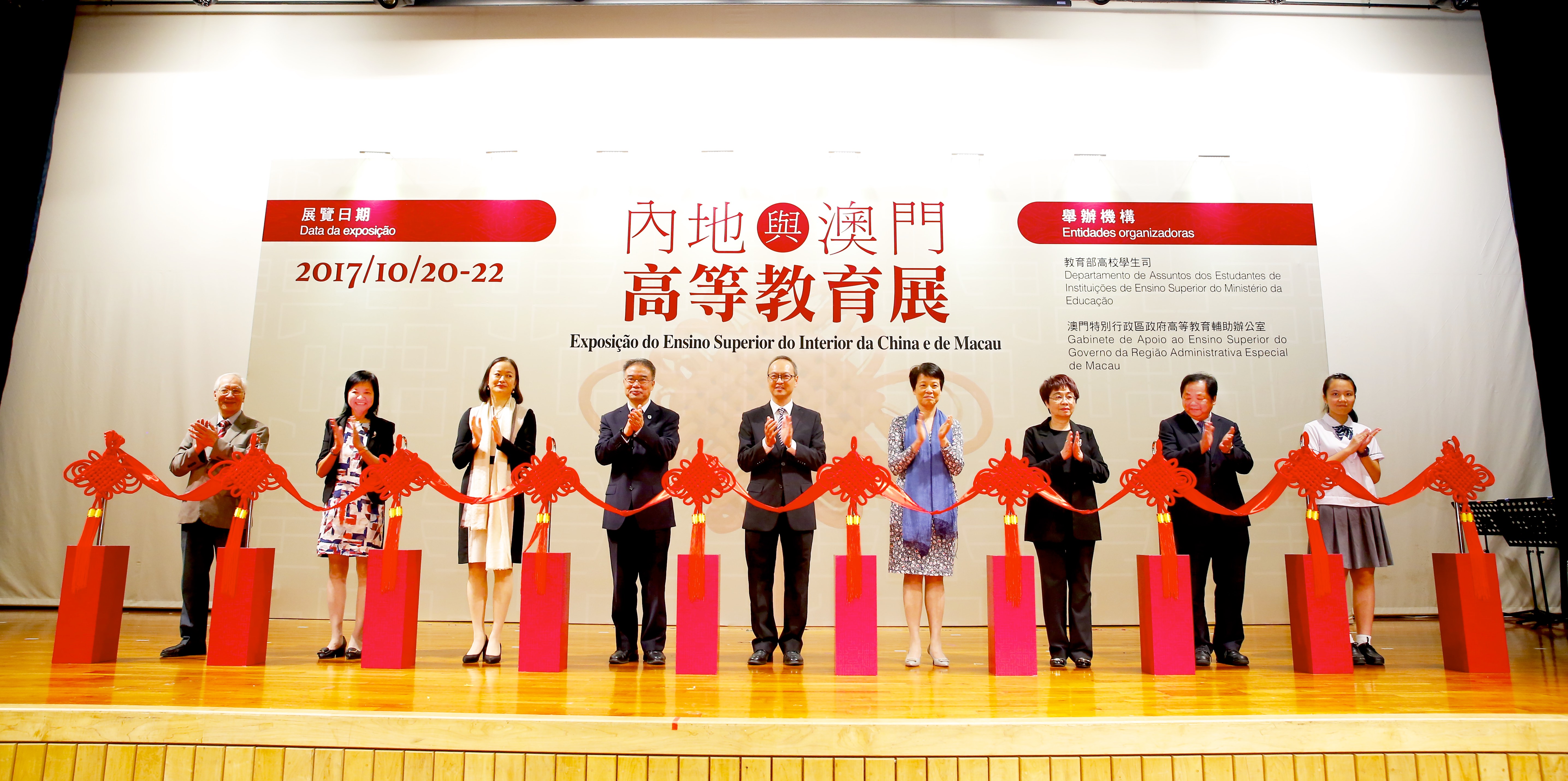 社會文化司司長代表、高等教育輔助辦公室主任蘇朝暉、中國內地高等院校訪問團團長、教育部港澳台事務辦公室常務副主任趙靈山、中央人民政府駐澳門特別行政區聯絡辦公室文化教育部部長徐婷、澳門基金會行政委員會副主席鍾怡、學生福利基金行政管理委員會主席、教育暨青年局局長梁勵、澳門中華教育會會會長何少金、澳門天主教學校聯會理事長黃彪、澳門大專教育基金會理事長朱威權等主持開幕禮。