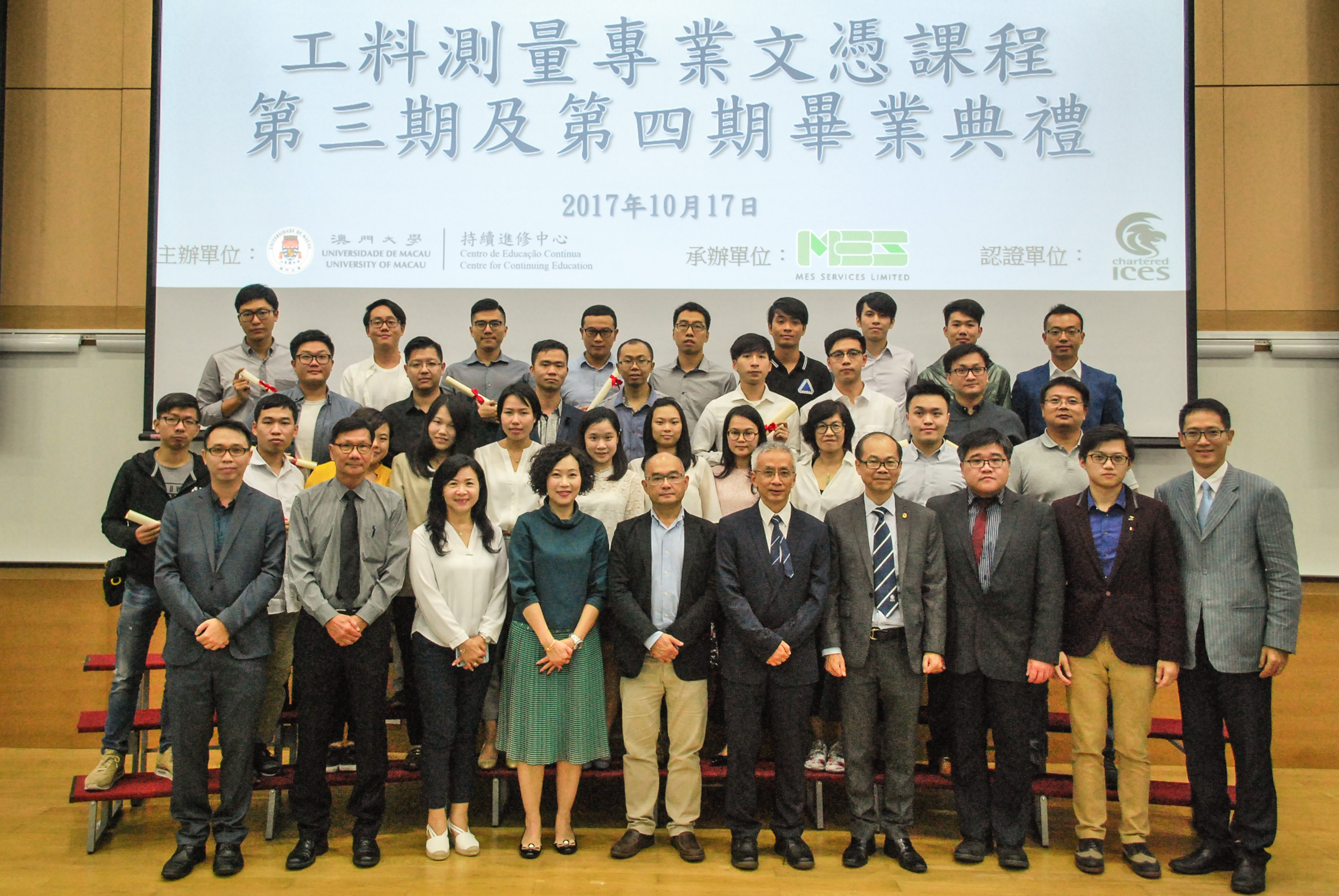 澳門大學持續進修中心日前為第三、四期“工料測量專業文憑課程"舉行畢業典禮,向46名學員頒發文憑,同時學員亦獲英國皇家特許土木工程測量師學會專業認證,有助澳門建築工程業界自我提升及與國際接軌。