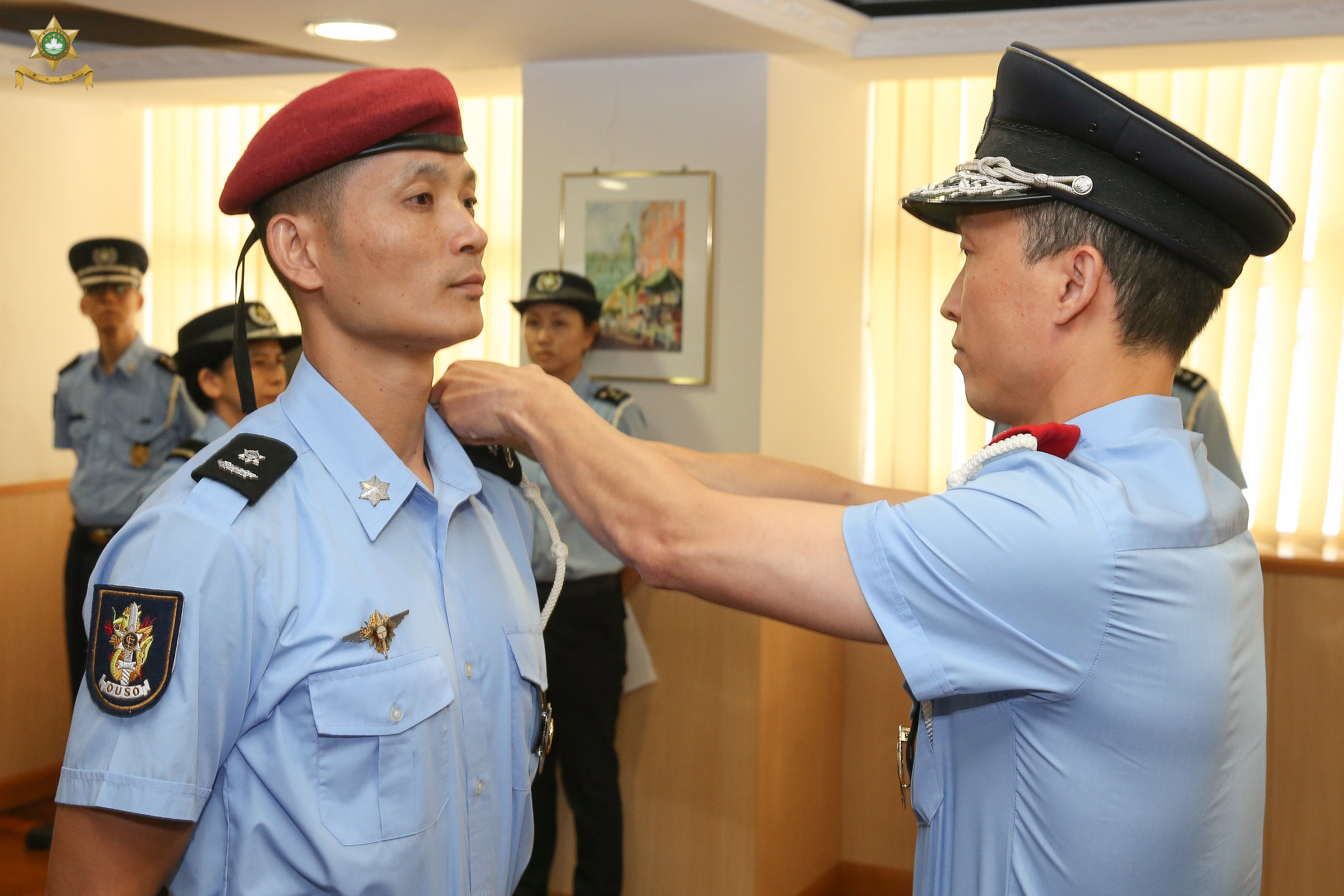 今天(10月27日)下午2時30分,在治安警察局總部舉行警長晉升儀式。儀式由治安警察局副局長黃子暉副警務總監主持,各部門主管均有出席。儀式簡單而莊嚴,各領導及主管為獲晉升警長人員戴上新肩章,作出熱烈祝賀並勉勵他們在新的職涯上有更好的表現。