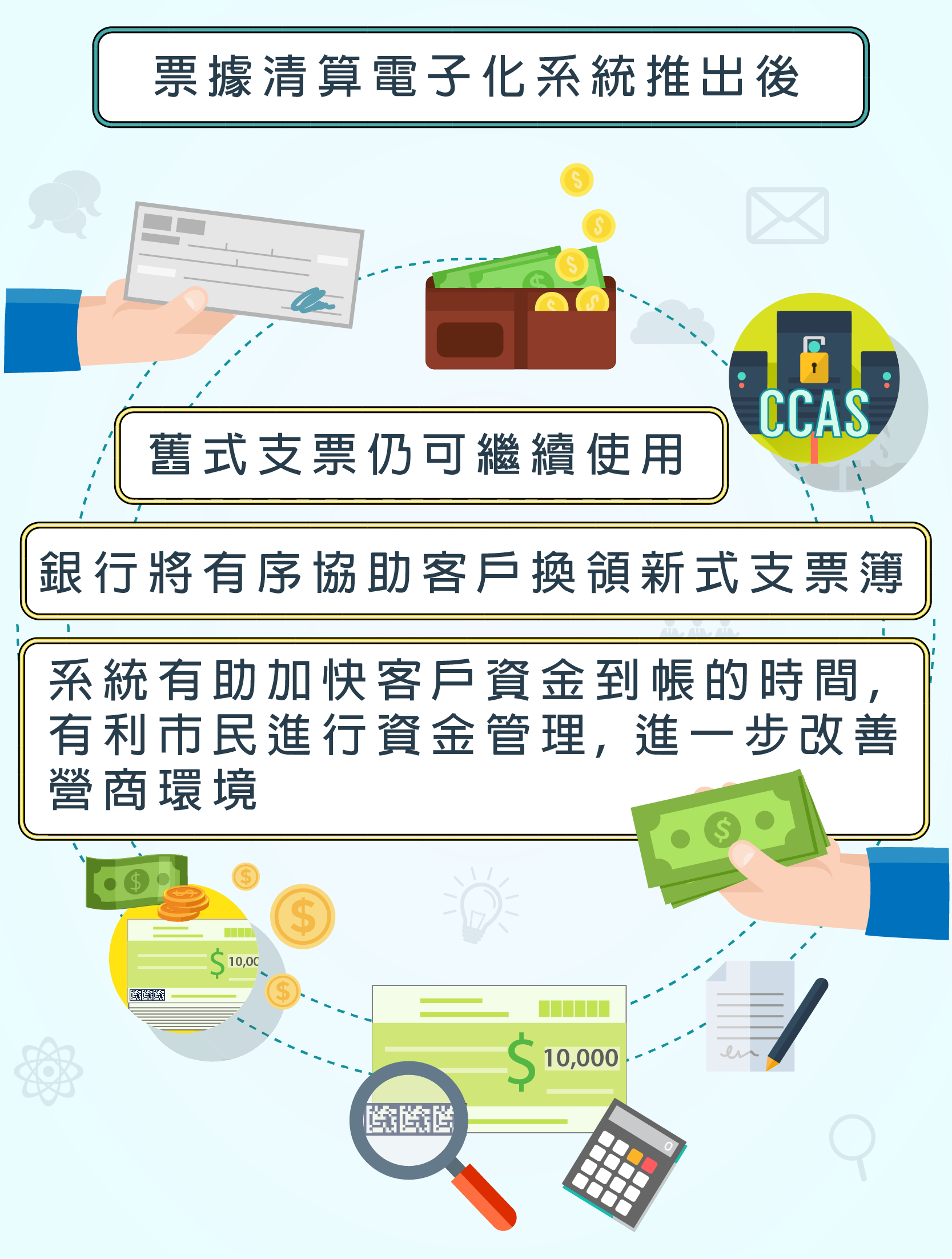 為配合澳門經濟的快速增長,促進本地金融業的發展,金管局與業界合作,作持續優化本澳的金融基礎設施。新建的票據清算電子化系統,為加快銀行票據兌付創設了必要條件,縮短客戶資金到帳時間,便利市民進行資金管理,以及從提升資金調撥效率方面改善營商環境。