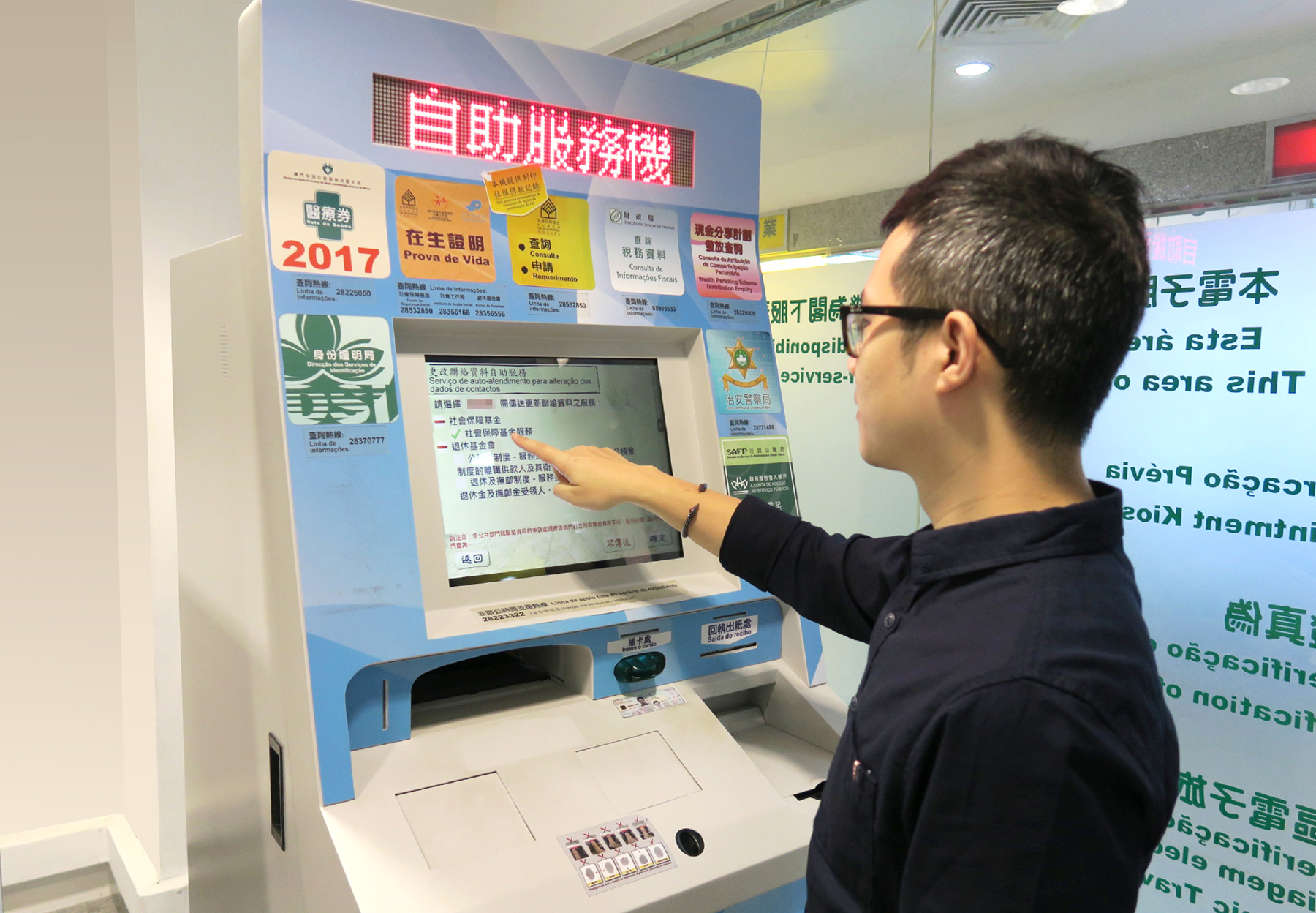 首階段,合作部門有社會保障基金及退休基金會,隨後將擴展至更多政府部門。現時,身份證明局於全澳42個地點設置共69台多功能自助服務機,提供涉及9個政府部門的自助服務,有關自助服務機的功能及地點,可瀏覽身份證明局網頁(www.dsi.gov.mo/kiosk_c.jsp)。