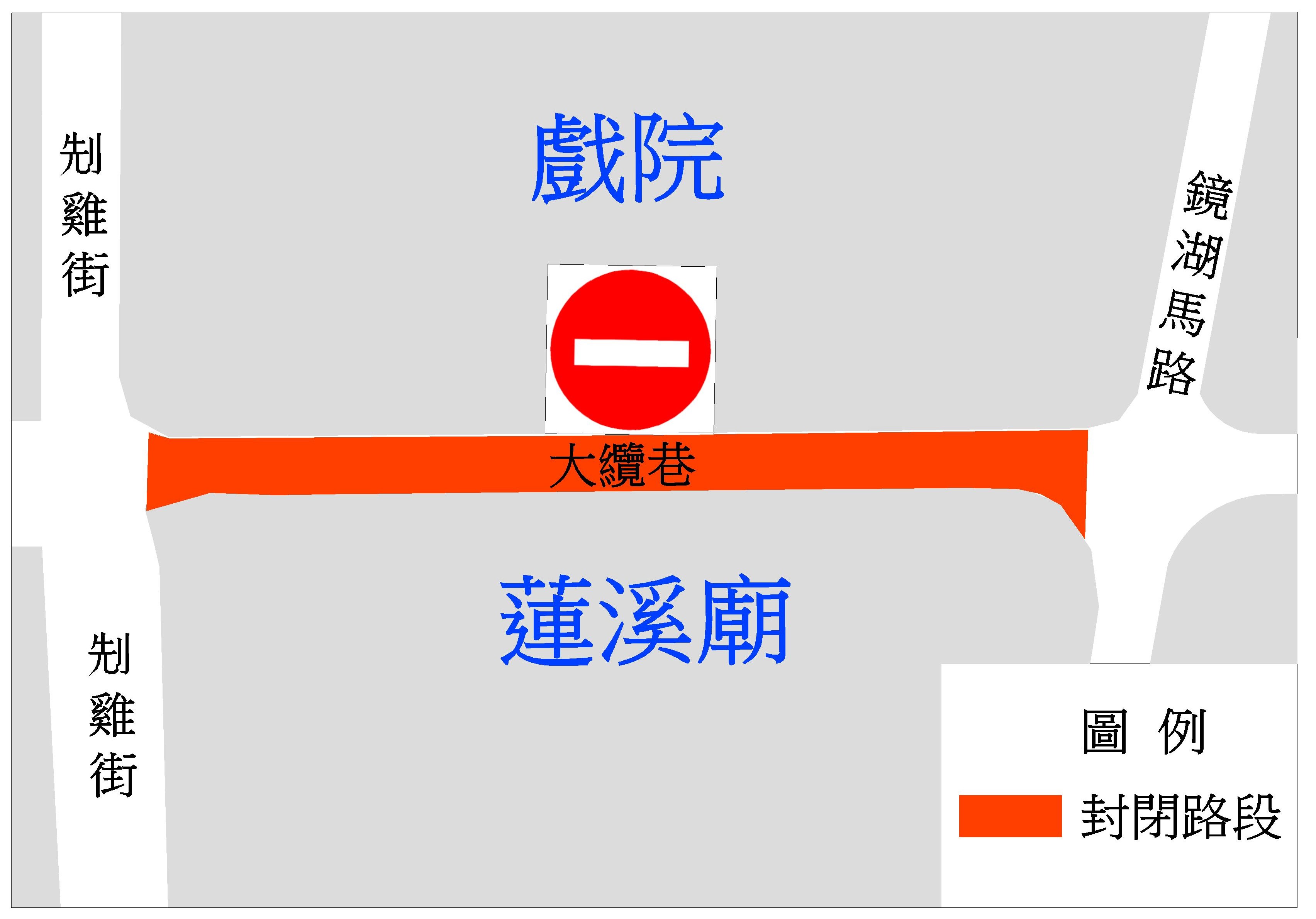 因應新橋區坊眾互助會舉辦恭祝華光寶誕活動,介乎(先刂)雞街與鏡湖馬路之間的一段大纜巷,於11月15日(周三)至17日(周五)每日下午5時至晚上8時實施有限度通車;11月15日(周三)至17日(周五)每日晚上8時至10時30分、11月16日上午11時30分至下午2時,以及11月18日(周六)下午6時至晚上10時30分實施封閉交通並禁止車輛停泊。