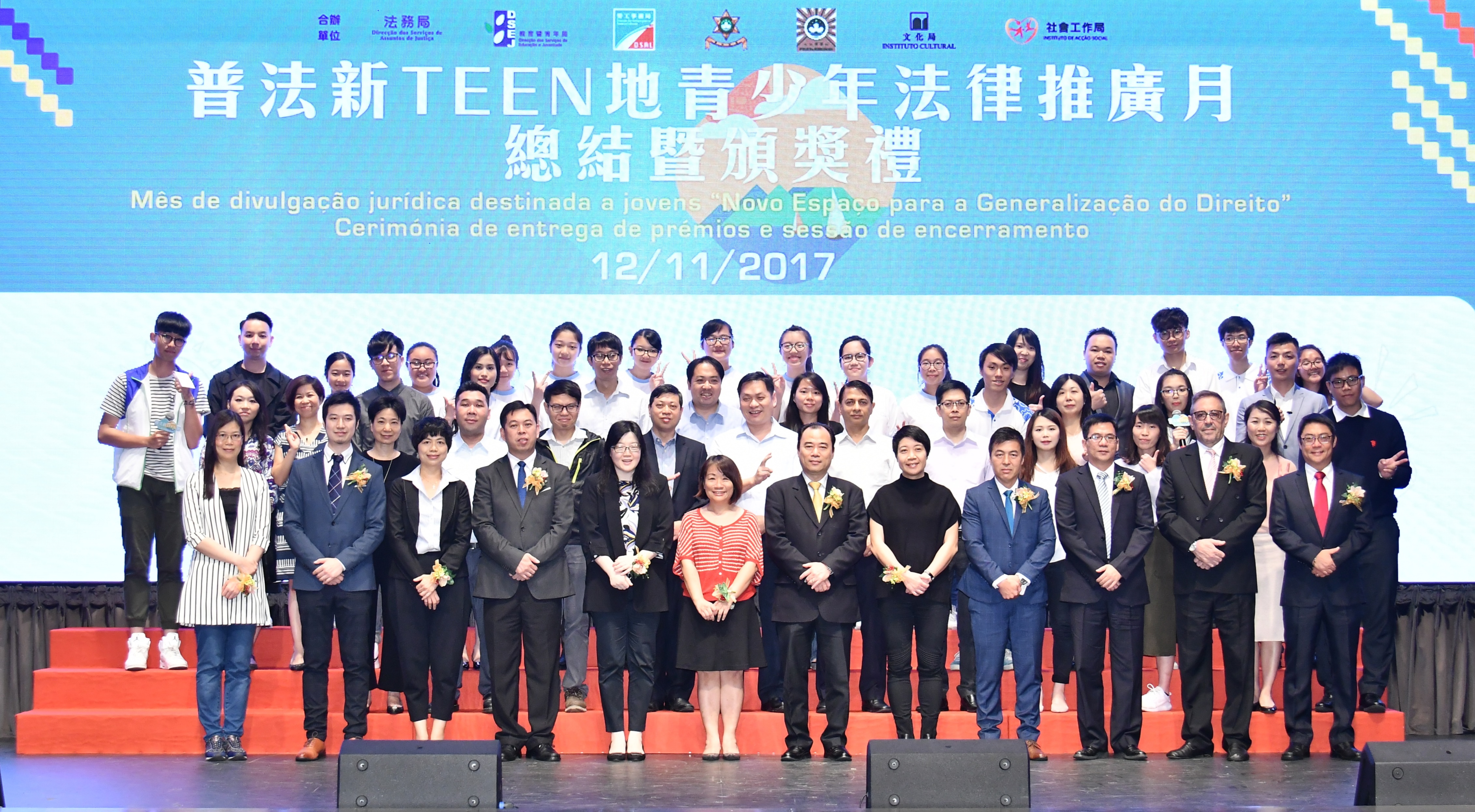 爲延續推廣法律普及工作,總結活動成效,主辦單位於11月12日假聖保祿學校禮堂舉行“普法新TEEN地”青少年法律推廣月總結暨頒獎禮,出席嘉賓包括法務局法律推廣及公共關係廳廳長羅靜萍、教育暨青年局青年廳廳長陳旭偉、勞工事務局就業廳廳長孟瑞怡、文化局文化遺產廳廳長梁惠敏、治安警察局行動廳代廳長趙崇遠、司法警察局司法警察學校校長孫錦輝、民政總署公民教育及資訊處代處長錢偉玉、警察總局警司羅志強、社會工作局社區協作處服務協調工作組職務主管黃柏基,以及非高等教育委員會委員蘇輝道、飛文基、委員代表梁文雁小姐及各參與學校/機構代表等。嘉賓分別向31個參與是次活動的學校/機構頒發感謝狀,以感謝他們對“普法新TEEN地”的支持;邀請青年分享參與活動的感受,青年們表示透過參與多元化活動,讓他們認識了各項法律知識;最後由法務局“普法動力”義工帶領青年進行法律訊息互動遊戲,並由澳門歌手程文政與嘉諾撒聖心英文中學學生合唱“小城說法”,用說唱形式表達《基本法》內容,活動在歌聲及歡笑聲中圓滿結束。