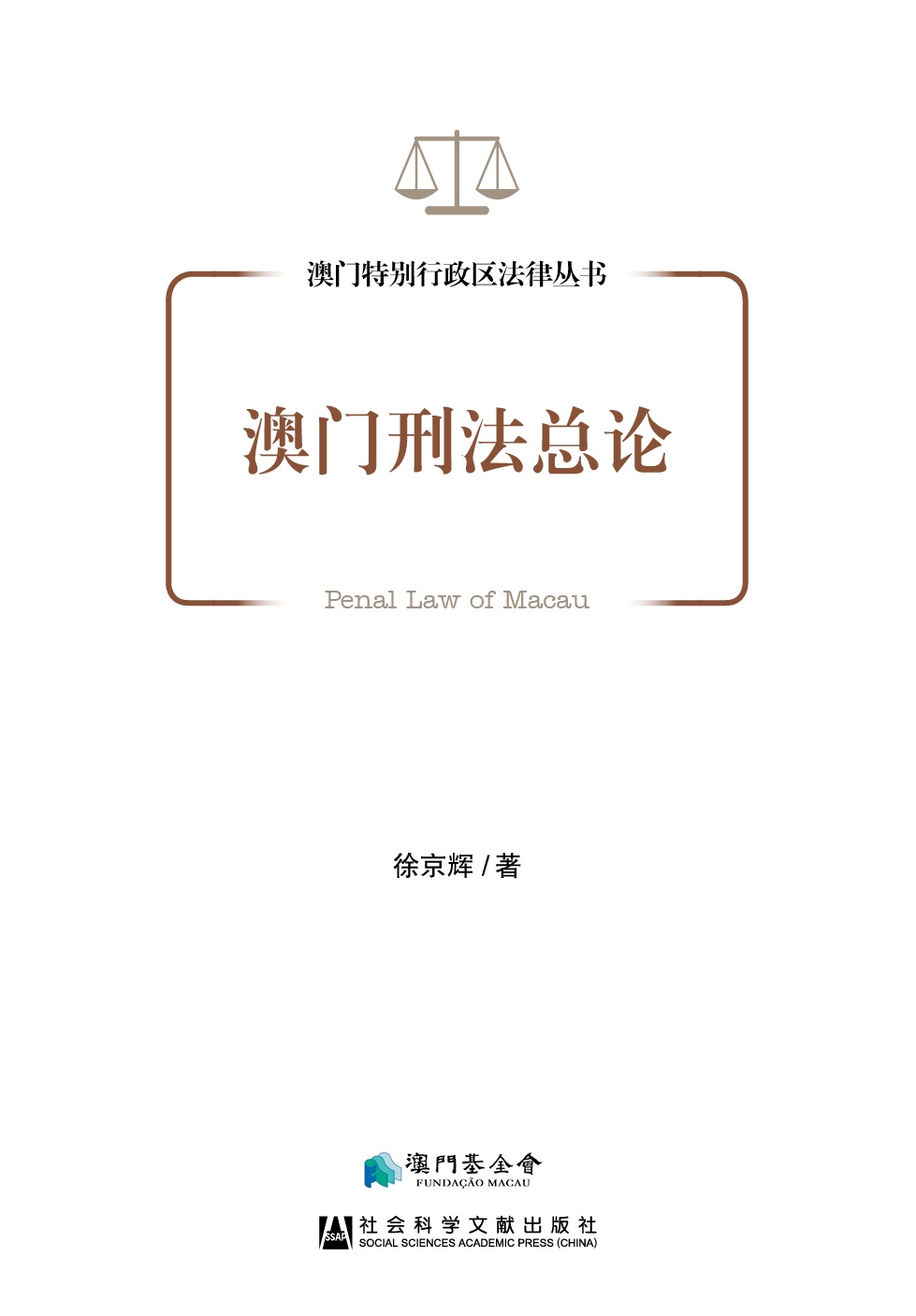 “澳門特別行政區法律叢書”之一、由徐京輝所著的《澳門刑法總論》,經已由澳門基金會與社會科學文獻出版社聯合出版,並於全國包括澳門地區同時發行。該書主要圍繞《澳門刑法典》總則的規定,結合相關的刑法理論和司法見解,系統而翔實地介紹了澳門特別行政區刑法總則所規範的法律關係。