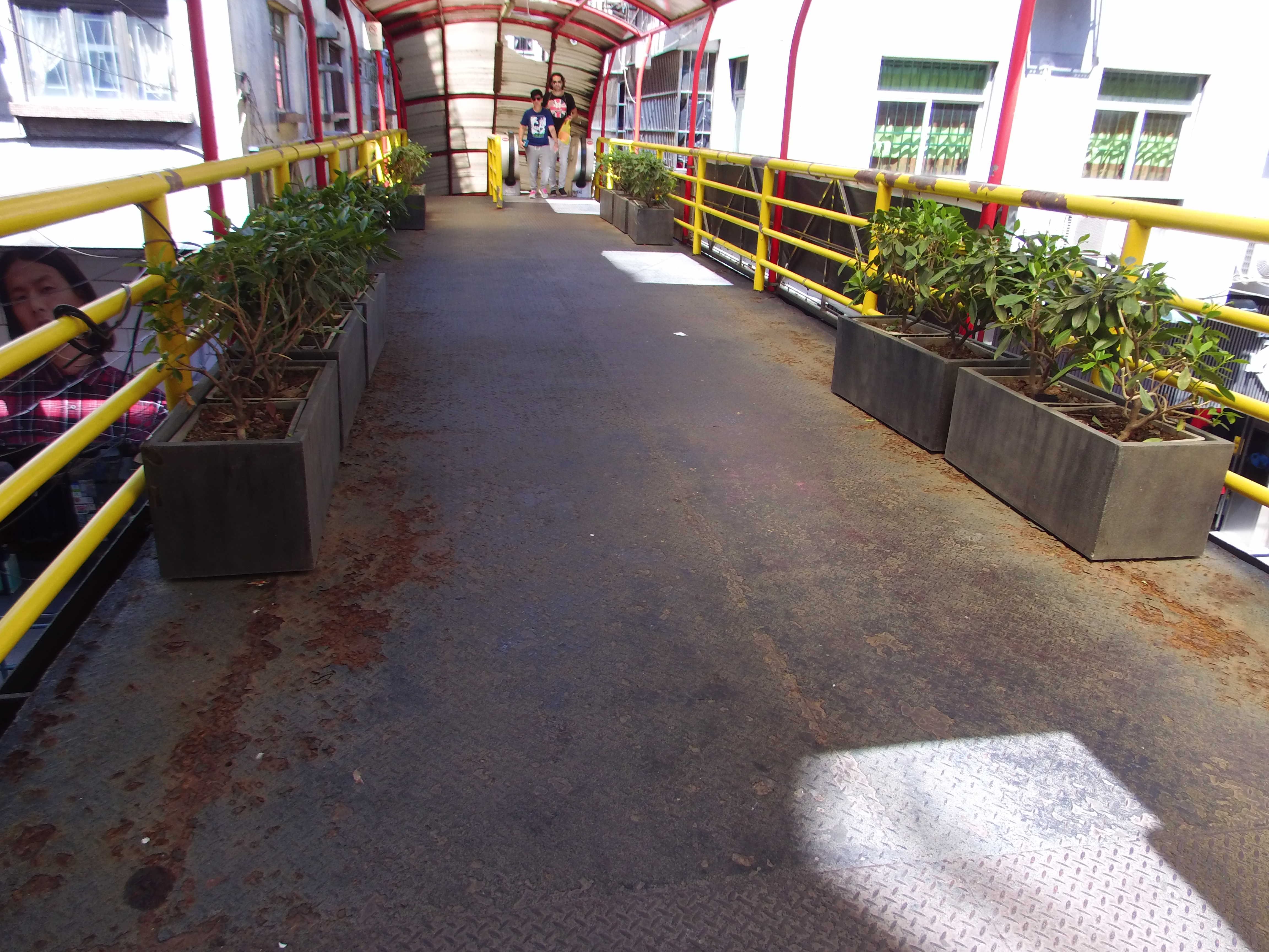 由於上述行人天橋使用頻繁,部分構件如樓梯級、鋪面鐵板及頂蓬等已出現生銹剝落等不同程度損壞,有需要進行維修保養。為回應市民訴求及保障使用者安全,民署開展天橋維修工程,主要更換天橋鋼板地台並鋪設防滑鋼沙、更換天橋頂蓬及雨水槽、清潔整座天橋、清除金屬結構的浮銹、污垢及現有油漆,以及重新塗髹油漆等。