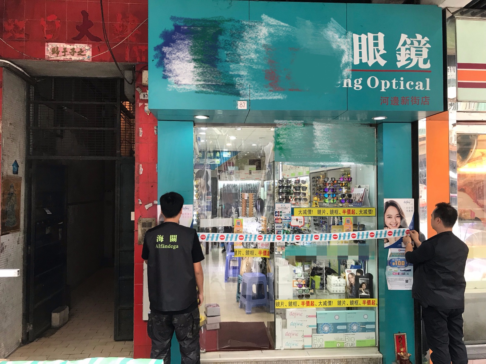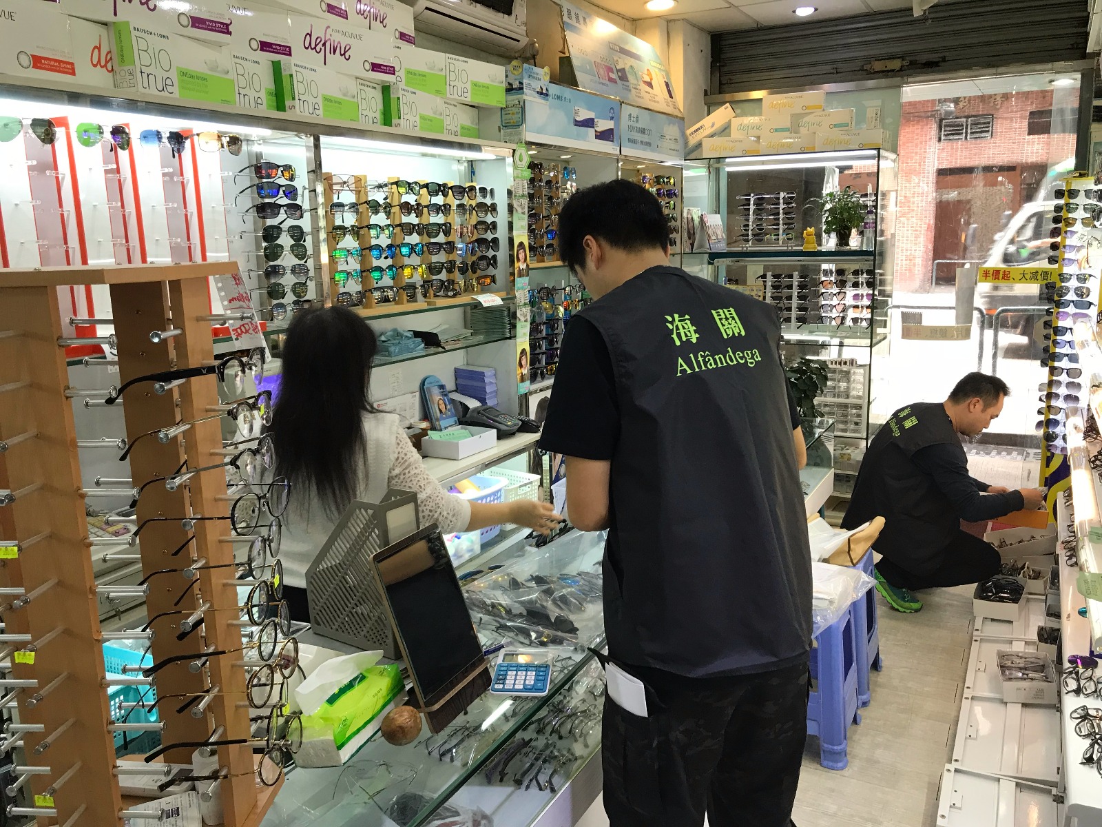 澳門海關接獲消費者投訴,指有眼鏡店舖涉嫌售賣假冒知名品牌眼鏡,海關收到舉報後展開偵查,發現涉案店舖合共七間,以連鎖店形式經營。海關於行動中搜出冒牌眼鏡一千五百多副,市值約一百五十萬元,有二人被捕。