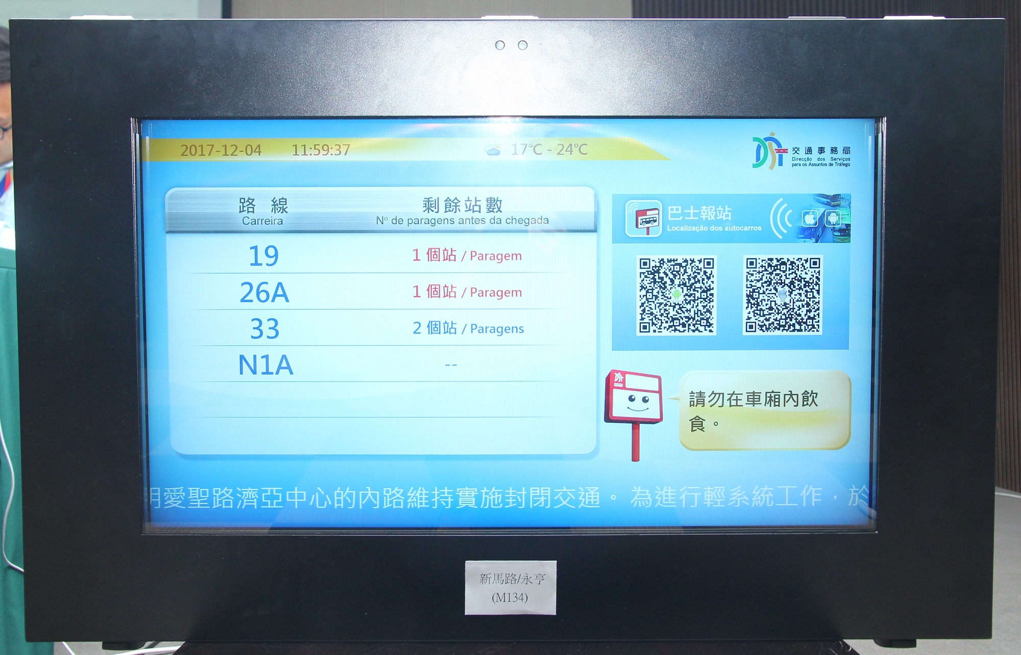 交通事務局透過「公共巴士管理系統」的報站功能,開發手機應用程式「巴士報站」App,除提供全澳82條巴士路線的實時到站資訊外,亦不斷新增功能,為市民提供更便捷的巴士資訊,做好出行安排。其中,早前交通事務局於26A及MT4路線各10台巴士引入車廂乘客數量估算系統,配合更新後的「巴士報站」App將增設巴士滿載資訊功能,以便乘客因應巴士車廂的擁擠情況考慮是否需要選乘其他巴士路線,局方期望可逐步將系統擴展至其他巴士車廂,完善整個系統功能。