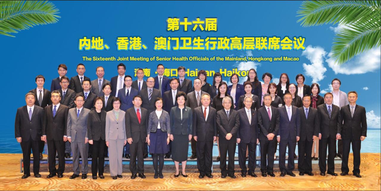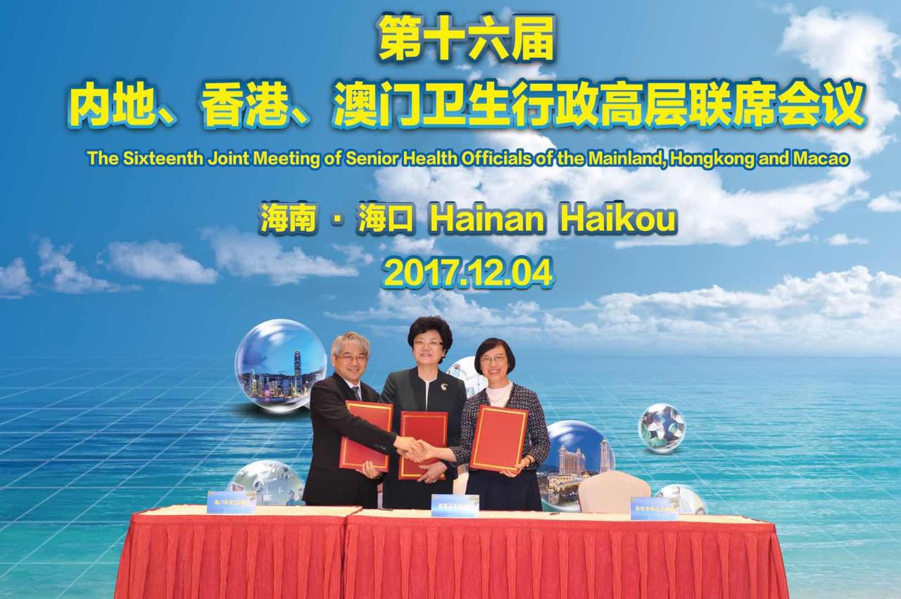 「第十六屆內地、香港、澳門衛生行政高層聯席會議」12月4日在海南省海口市召開,來自三地衛生行政部門的主管和專家50餘人,分享三地衛生與健康發展的經驗,並商討進一步加強衛生合作。國家衞生和計劃生育委員會李斌主任、海南省沈曉明省長,香港食物及衞生局陳肇始局長、澳門衛生局李展潤局長分別率團出席了會議。