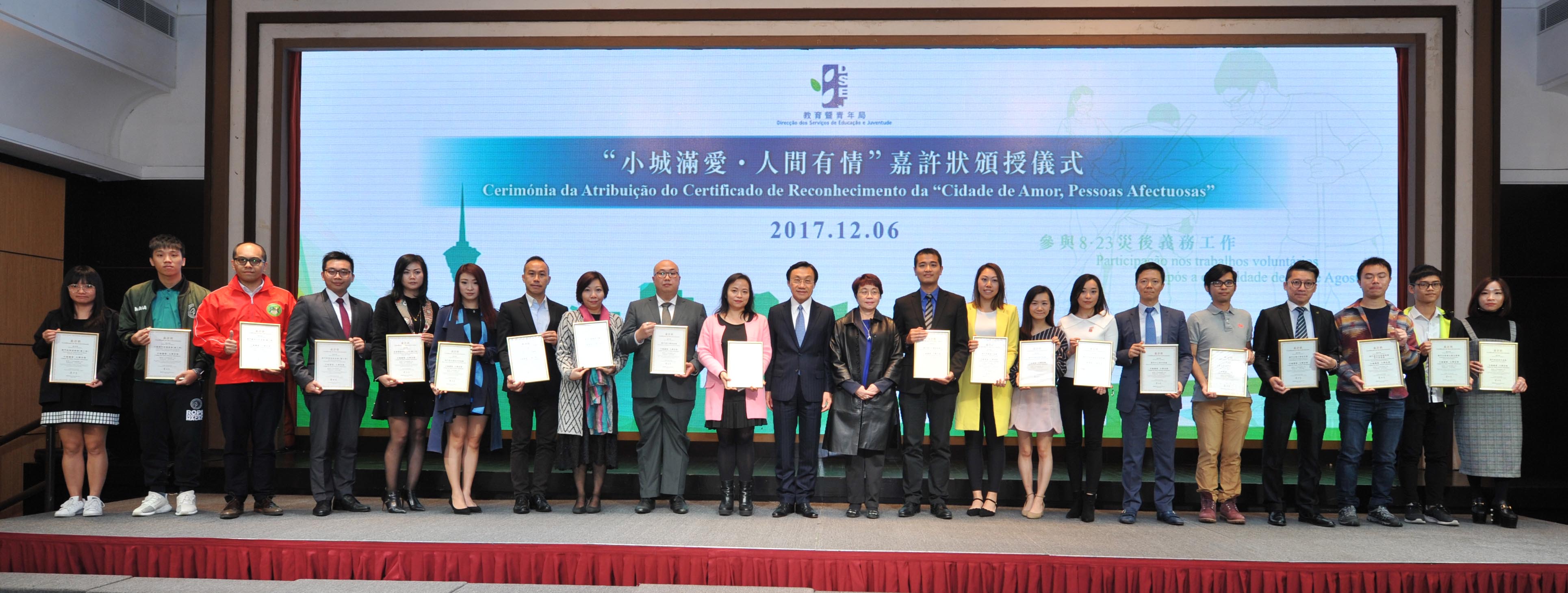 非高等教育委員會和青年事務委員會於12月6日下午假旅遊塔舉行聯合座談會。會議由兩個委員會的主席、社會文化司司長譚俊榮主持。會前舉行了“學校發展計劃”資助申請之“申請範疇ISO9001:2015質量管理體系認證”證書頒授儀式,並由譚俊榮向參與8.23災後義務工作的青年社團頒發了“小城滿愛‧人間有情”嘉許狀。