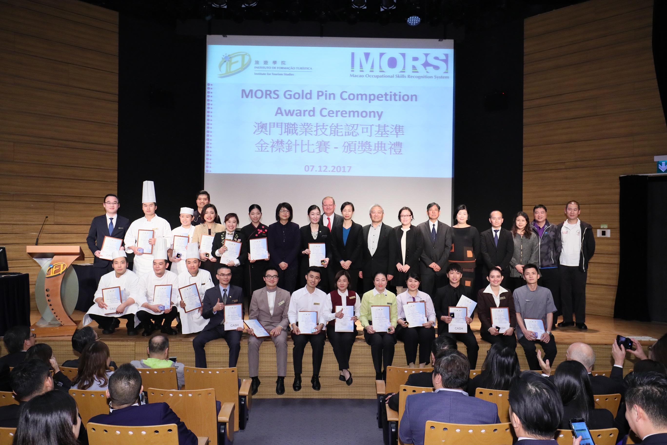 旅遊學院於12月7日舉行『澳門職業技能認可基準』(MORS) 2017金襟針大賽頒獎典禮,由勞工事務局吳惠嫻副局長、旅遊局執照及監察廳鍾卓業代廳長行政財政廳方丹妮廳長、新葡京酒店William Visser總經理、澳門飲食業聯合商會陳澤武會長及澳門酒店旅業職工會李寶來會長擔任頒獎嘉賓。