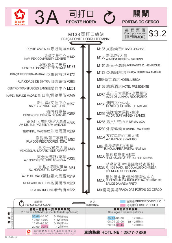 為加強行車安全及擴大服務範圍,由12月15日(周五)首班車起,3A及30X巴士路線調整停靠站點,包括取消停靠“馬場東大馬路”巴士站,新增停靠“勞動節街/中葡職業技術學校”及“黑沙環中街/黑沙環衛生中心”站,交通事務局呼籲乘客留意。