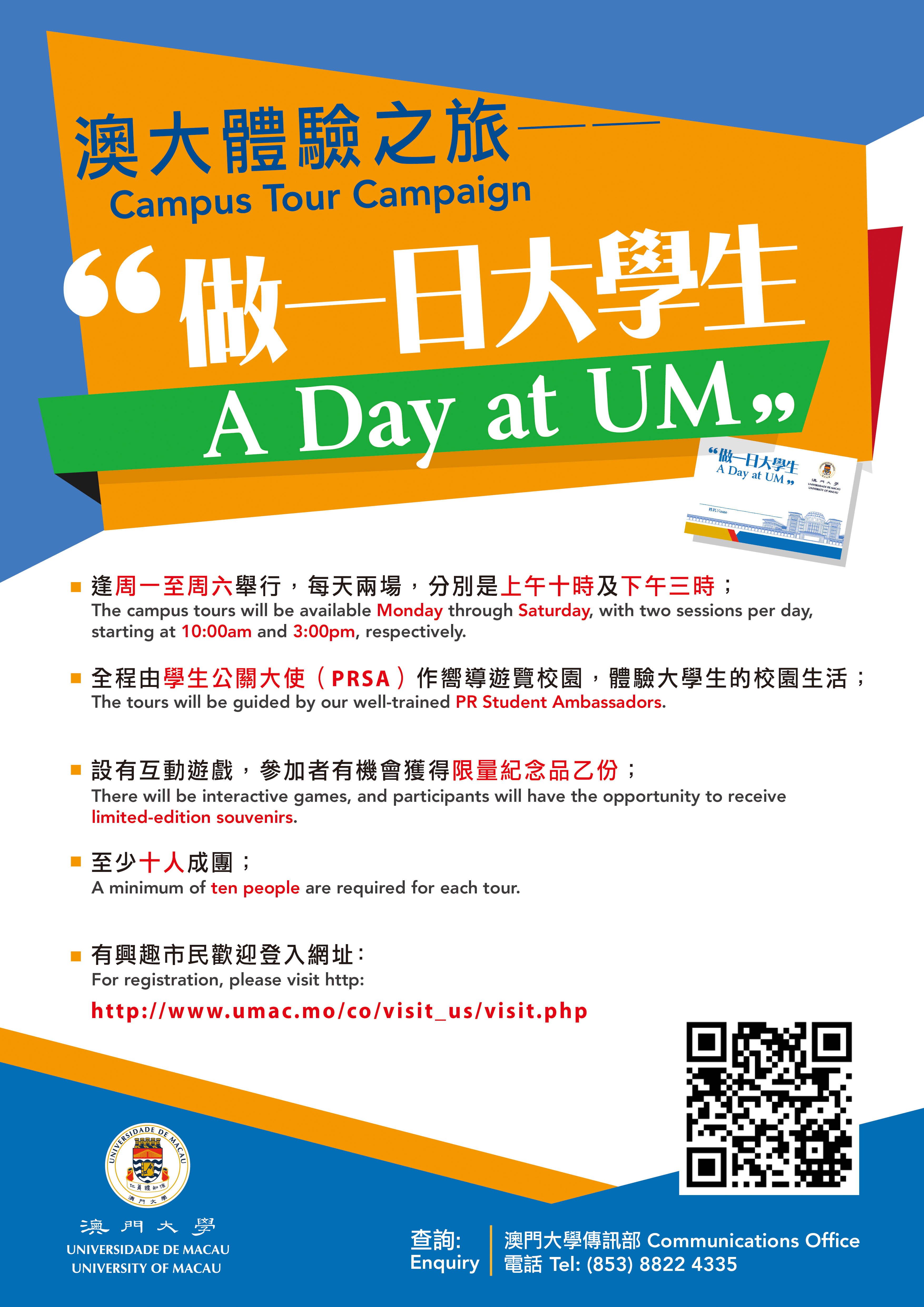 澳門大學自搬遷至新校園,吸引眾多市民及遊客參觀,訪客人數已超過五萬人次。為讓大眾更深入感受大學生的校園生活,澳大特別推出澳大體驗之旅──“做一日大學生",由學生公關大使帶領參加者感受澳大課堂內外多姿多彩的生活,遊走澳大必去之地和細聽澳大人故事,歡迎有興趣社團或人士報名參加。