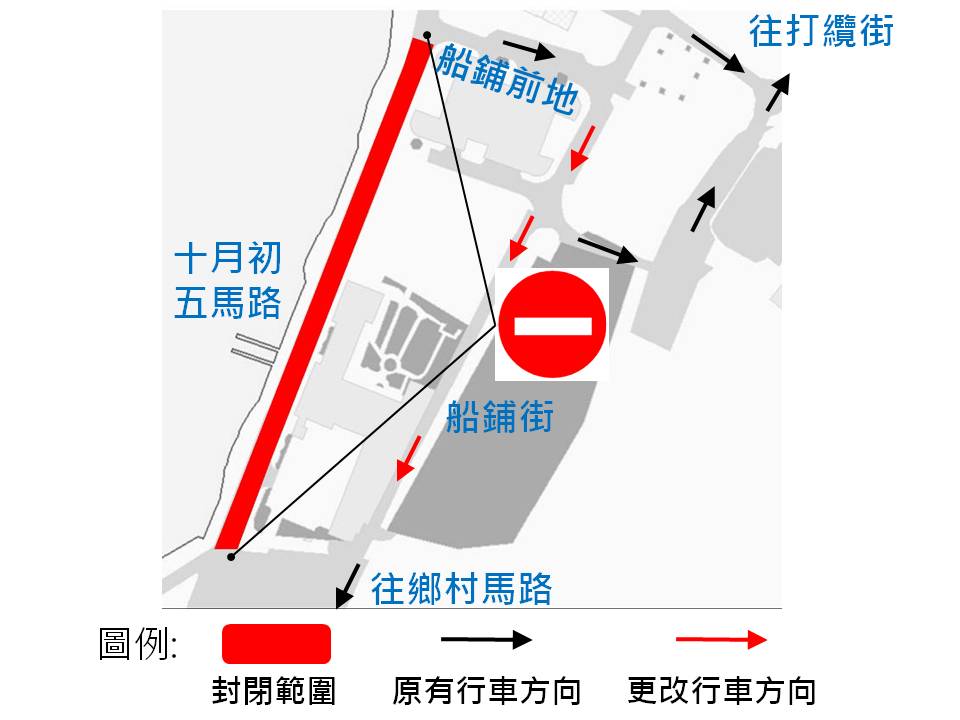 因民政總署進行第二階段更換路環壓力渠工程,12月16日(周六)上午10時起至2018年1月20日(周六),介乎船鋪前地與譚公廟前地之間一段十月初五馬路封閉交通,該路段部分咪錶泊車位及電單車泊車位禁止泊車;介乎船鋪前地與譚公廟前地之間一段船鋪街實施反方向行車;12月18日(周一)至2018年1月20日(周六)介乎路環恩尼斯總統前地與長勝大廈之間一段路環田畔街實施交通訊號燈控制下之單一車道輪流通車。