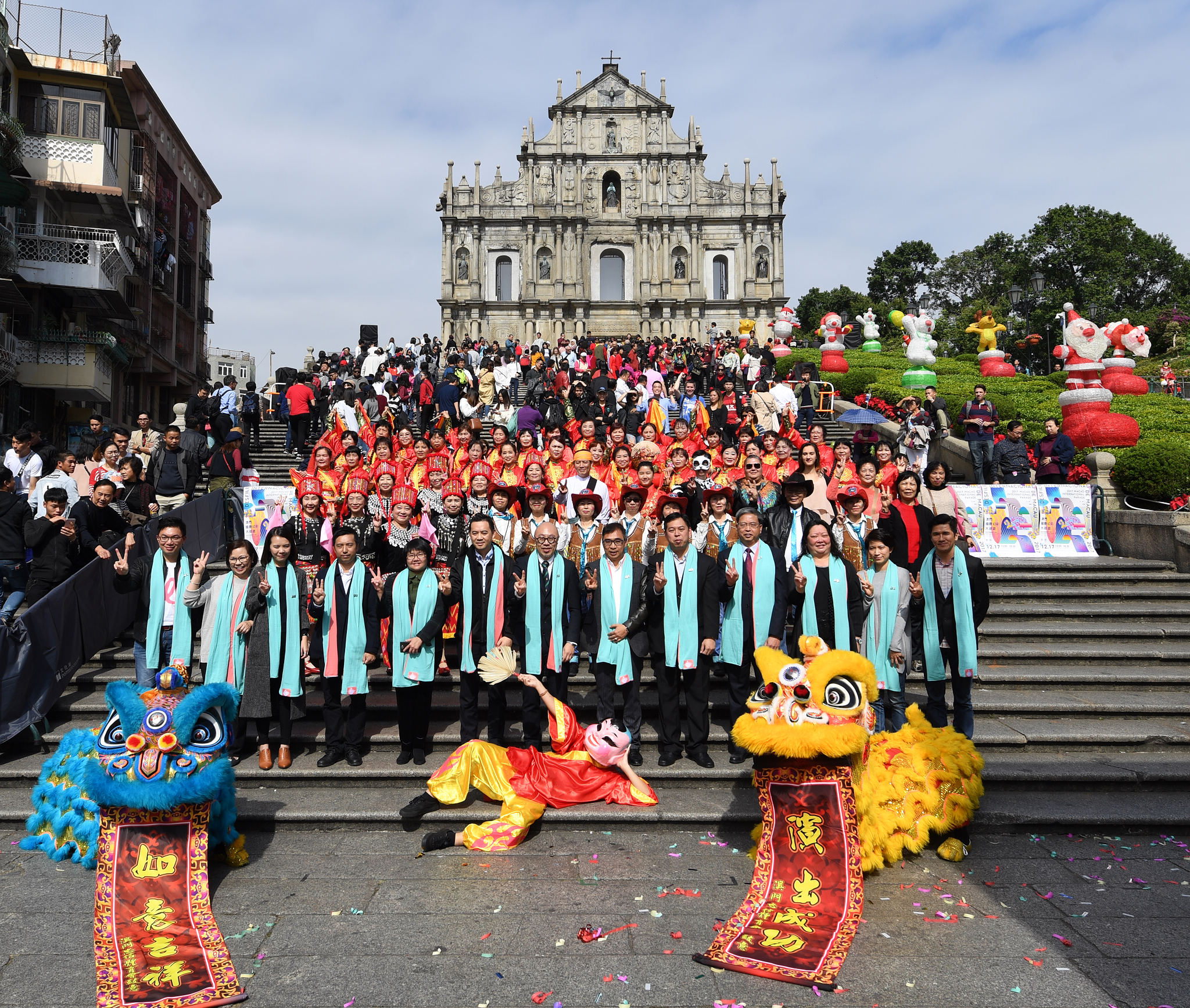 為慶祝澳門回歸祖國十八周年,文化局聯合多個政府及民間機構於本周日(十二月十七日)舉行《2017澳門國際幻彩大巡遊》。為祝願盛事順利舉行,文化局特於今日(十二月十四日)在大三巴牌坊耶穌會紀念廣場進行拜神儀式並設醒獅助慶,吸引眾多市民駐足圍觀,場面熱鬧歡愉。
