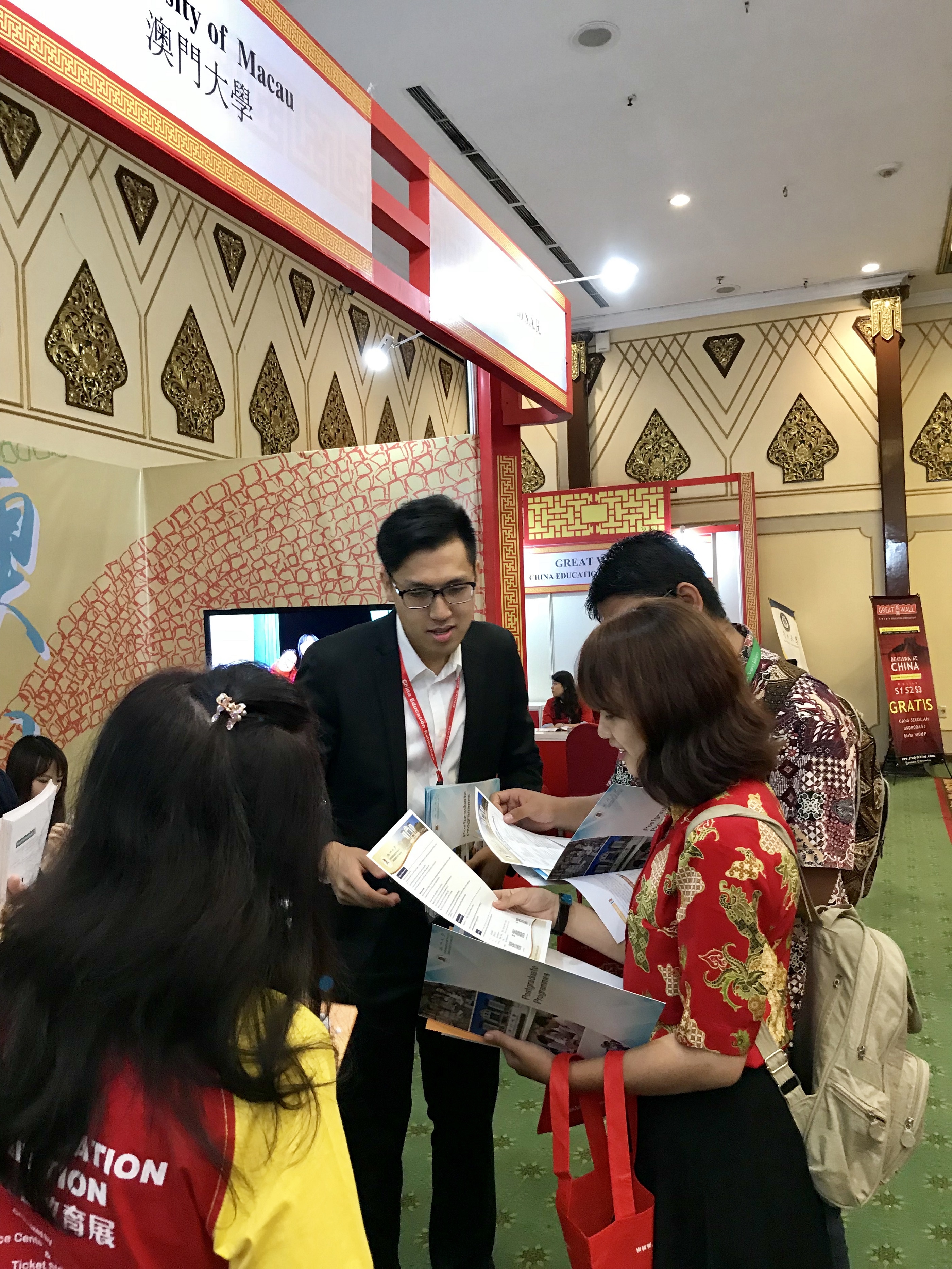 教育部留學服務中心於本年11月24日率領27所內地院校和澳門高校參展,當中包括澳門大學、澳門理工學院、旅遊學院、澳門科技大學、澳門城市大學、聖若瑟大學、澳門鏡湖護理學院。本澳參展團於展覽會設置展位,介紹澳門高等教育現況,以及派發澳門參展高校的招生宣傳單張,並與學生和家長面對面交流,提供諮詢,讓海外學生和家長瞭解本澳高等教育概況和掌握澳門高校招生訊息。另外,參展團除了參加“中印尼高校交流會”,介紹最新高教發展情況及留學概況外,還參訪塔魯瑪迦大學,與該校代表進行交流。