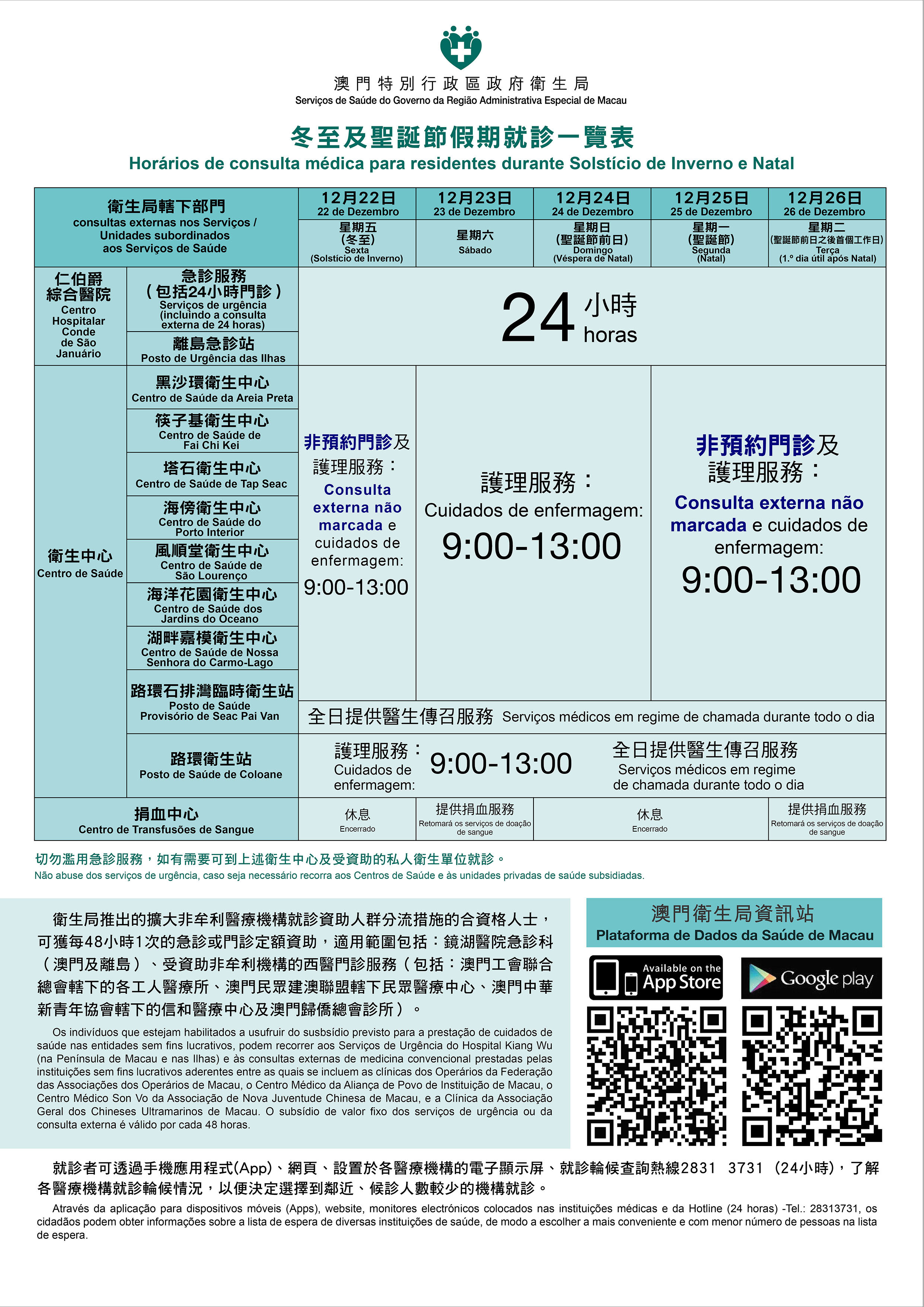 2017年12月22日(星期五)是冬至、12月24日及25日及(星期日、一)是聖誕節前日及聖誕節公眾假期,而12月26日(星期二)是行政長官批示公共行政工作人員獲准豁免上班日,政府部門休息,衛生局將維持相關醫療服務,為此作出如下就診安排: