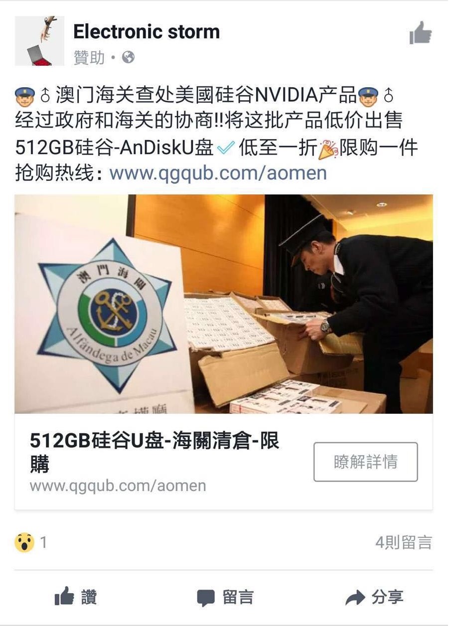 社交網站facebook上先後有名為“Electronic storm”及“Electronic products”的註冊用戶發佈貼文,聲稱一批無法正常通關的USB記憶體被澳門海關扣押,經協商後以超低價出售。澳門海關澄清並無此事,由於貼文利用澳門海關新聞圖片向外發佈虛假訊息,事件已交由相關部門跟進。