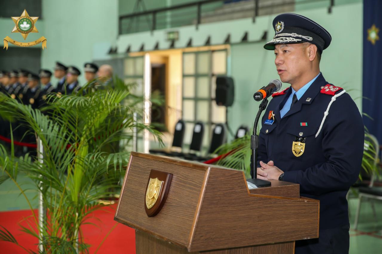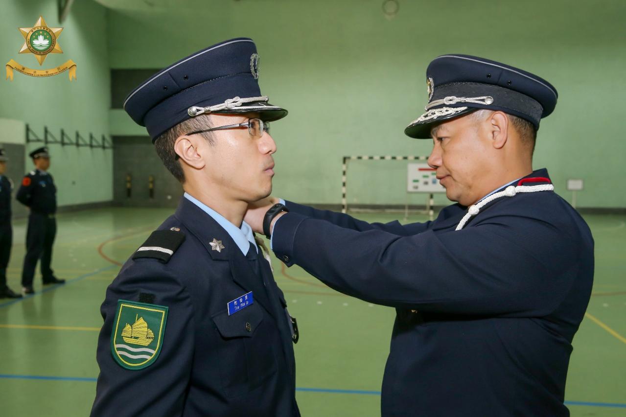 今天(12日)上午11時30分,在治安警察局特警隊大樓內舉行副警長晉升儀式。儀式由治安警察局局長梁文昌警務總監、副局長黃子暉副警務總監和代副局長梁漢新警務總長主持,各部門主管均有出席。儀式簡單而莊嚴,各領導及主管為獲晉升副警長人員戴上新肩章,並作出熱烈祝賀。